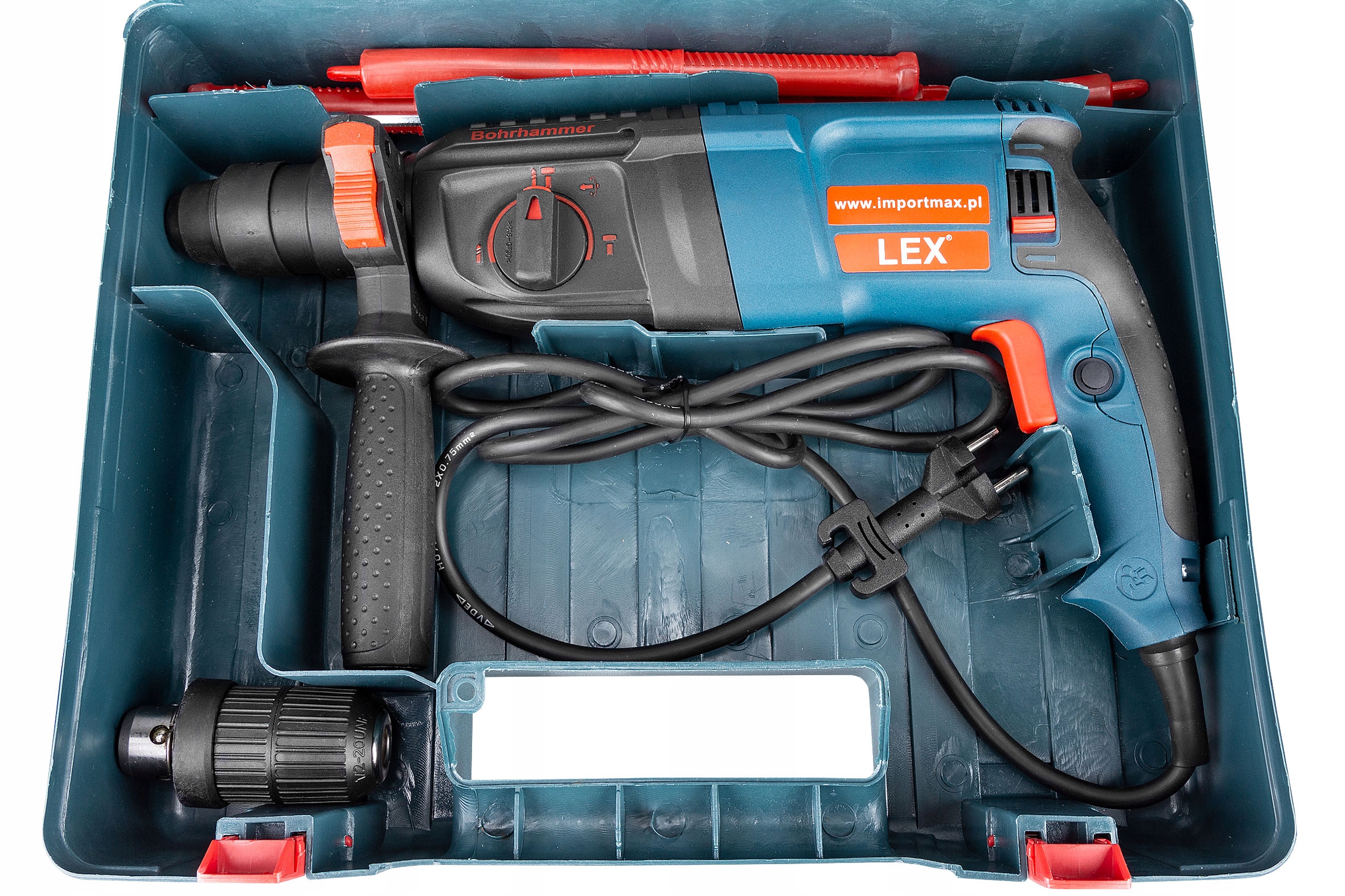 Ударний молоток Ударний дриль LEX має ефективний двигун потужністю 2400 Вт. Пропонований пристрій є продуктом, який можна використовувати як для ремонту будинку, так і для більш важких будівельних робіт.