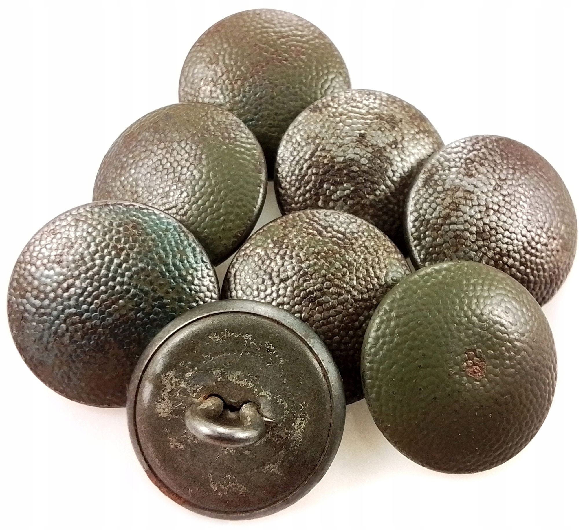 Так звані формені гудзики горошок, французьке експортне виробництво, двошаровий - підходить для офіцерських звань, аверси в різному стані збереження, вкриті фарбою відтінку фельдграу, реверси підписані персонажем. коло з якорем і гранатою, повністю виготовлене зі сталі.