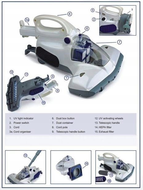 Ультрафіолетова стерилізація, яка вбиває кліщів, їх яйця та інші мікроорганізми, а також широка всмоктуюча насадка, розміщена там же, де й ультрафіолетові лампи.