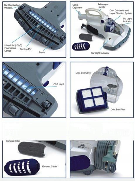 ультрафіолетова лампа, яка вбиває до 99,9% бактерій, і подвійна система фільтрації, яка видаляє вдвічі більше мікроорганізмів, ніж звичайний пилосос. очисник.