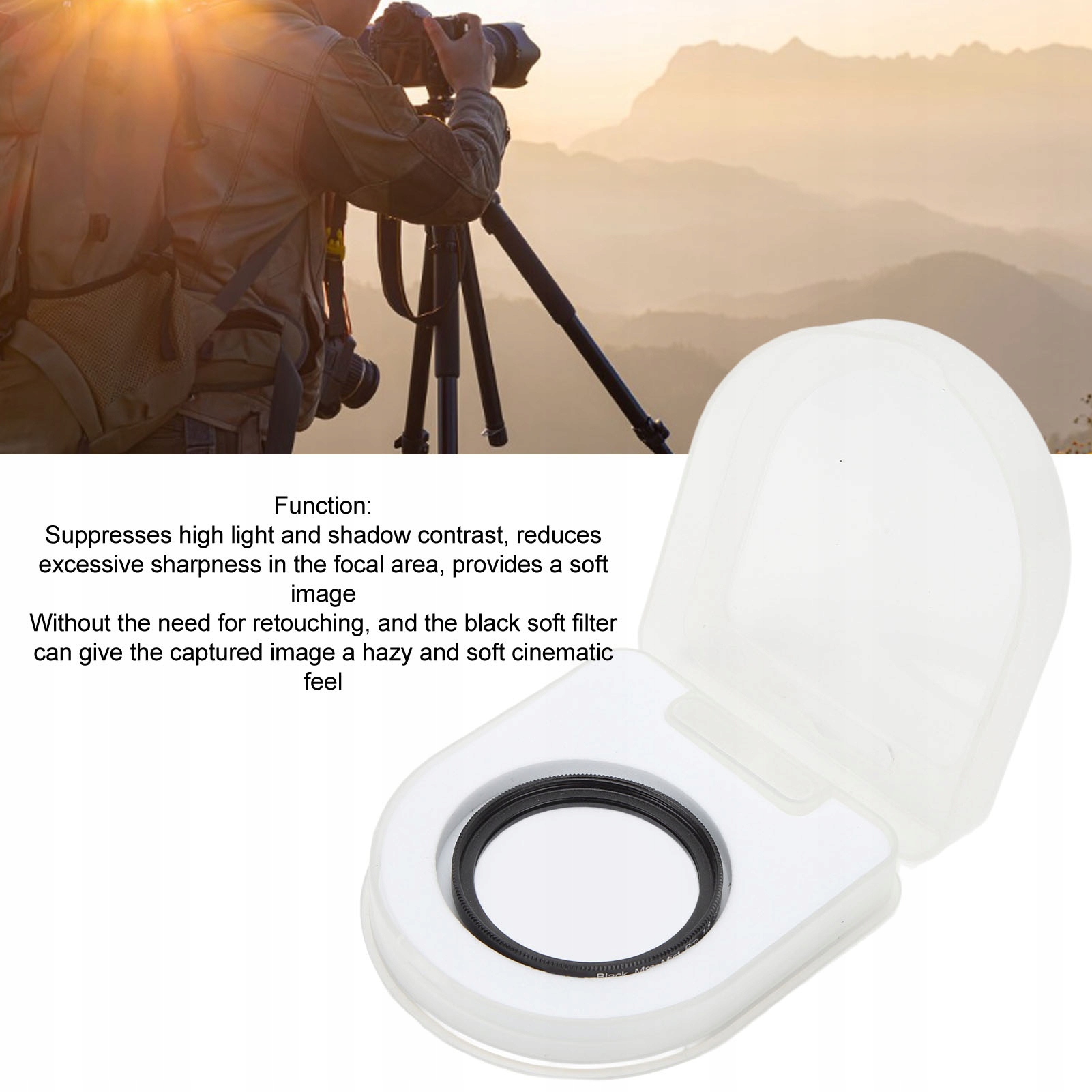1. Функція фільтра: пригнічує високу контрастність світла й тіні, зменшує надмірну різкість у зоні фокусування, забезпечує м’яке зображення без необхідності ретушування, а чорний м’який фільтр може надати знятому зображенню туманного та м’якого кінематографічного відчуття.