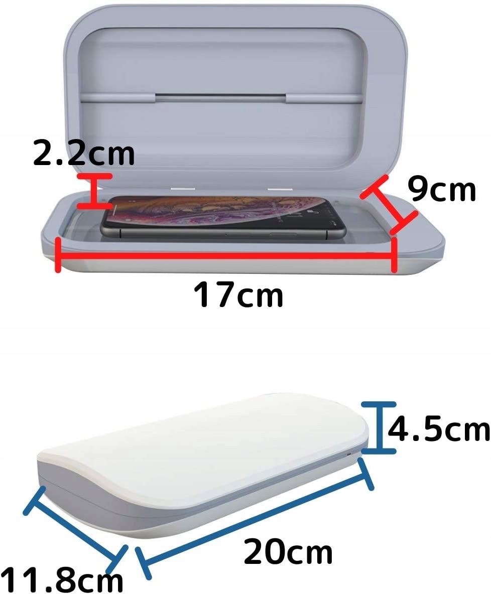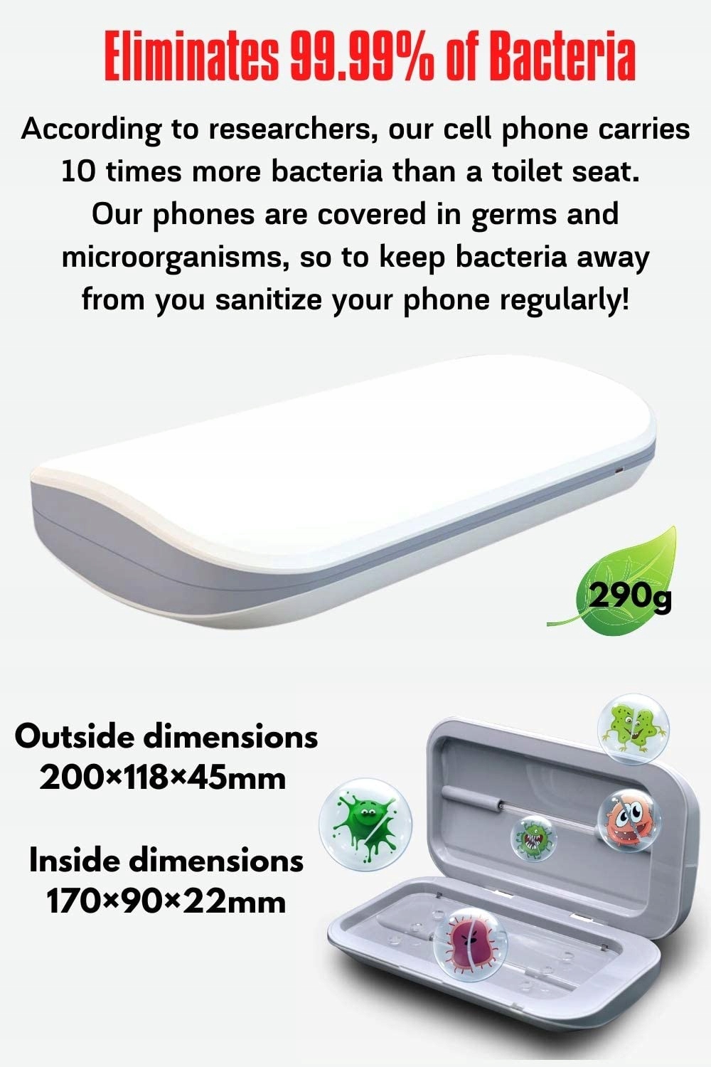 Контейнер для дезінфекції можна використовувати для мобільних телефонів до 7 дюймів, таких як iPhone, Samsung Nexus, LG, Motorola, Sony, HTC, Huawei тощо. Зовнішні розміри УФ-стерилізатор 20 x 11,8 x 4,5 см, внутрішні розміри 17 x 9 x 2,2 см.