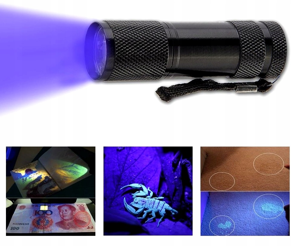 ✅ Цей УФ-ліхтарик оснащений 9 світлодіодами, які генерують ультрафіолетове світло з довжиною хвилі 395-400 нм.