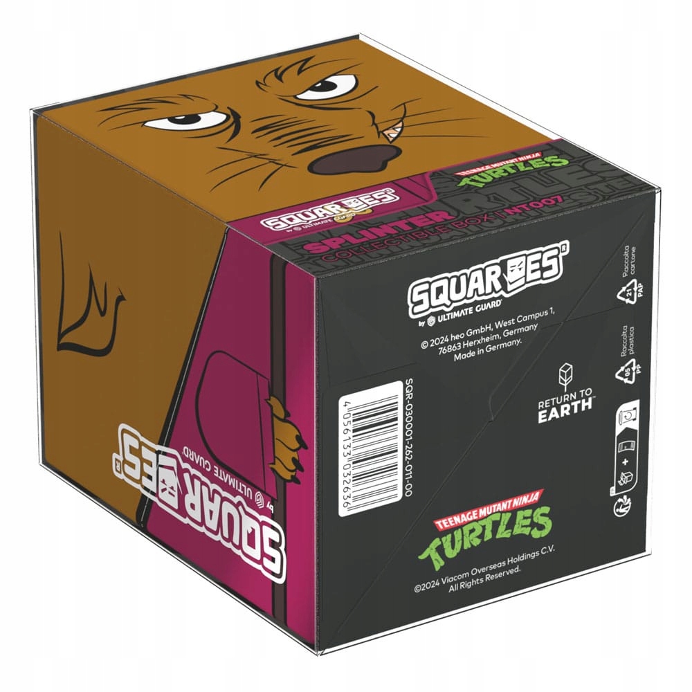 Колекційна коробка для зберігання колод TCG, аксесуарів для настільних ігор та/або предметів колекціонування. Splinter Squaroe із видання Teenage Mutant Ninja Turtles™ вміщує до 100 карток у подвійних захисних чохлах, якщо використовувати їх як ящик для колод. Squaroes виготовлені на 78% з поновлюваних ресурсів і ідеально поміщаються в окремо доступний колекційний футляр.
