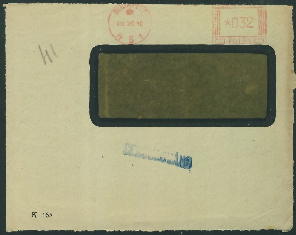 Угорщина Будапешт 1938 - мех.Censurovano francatura