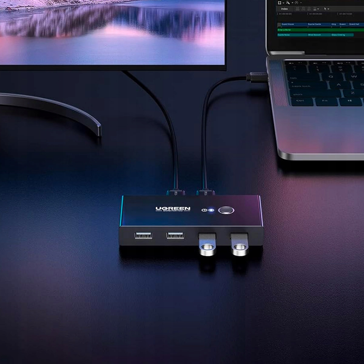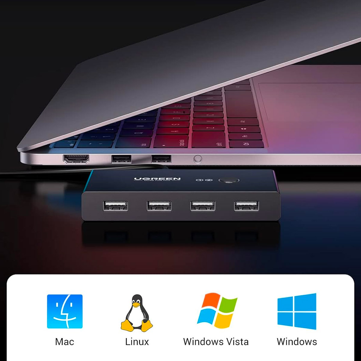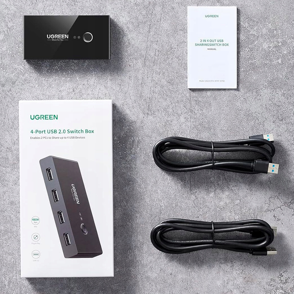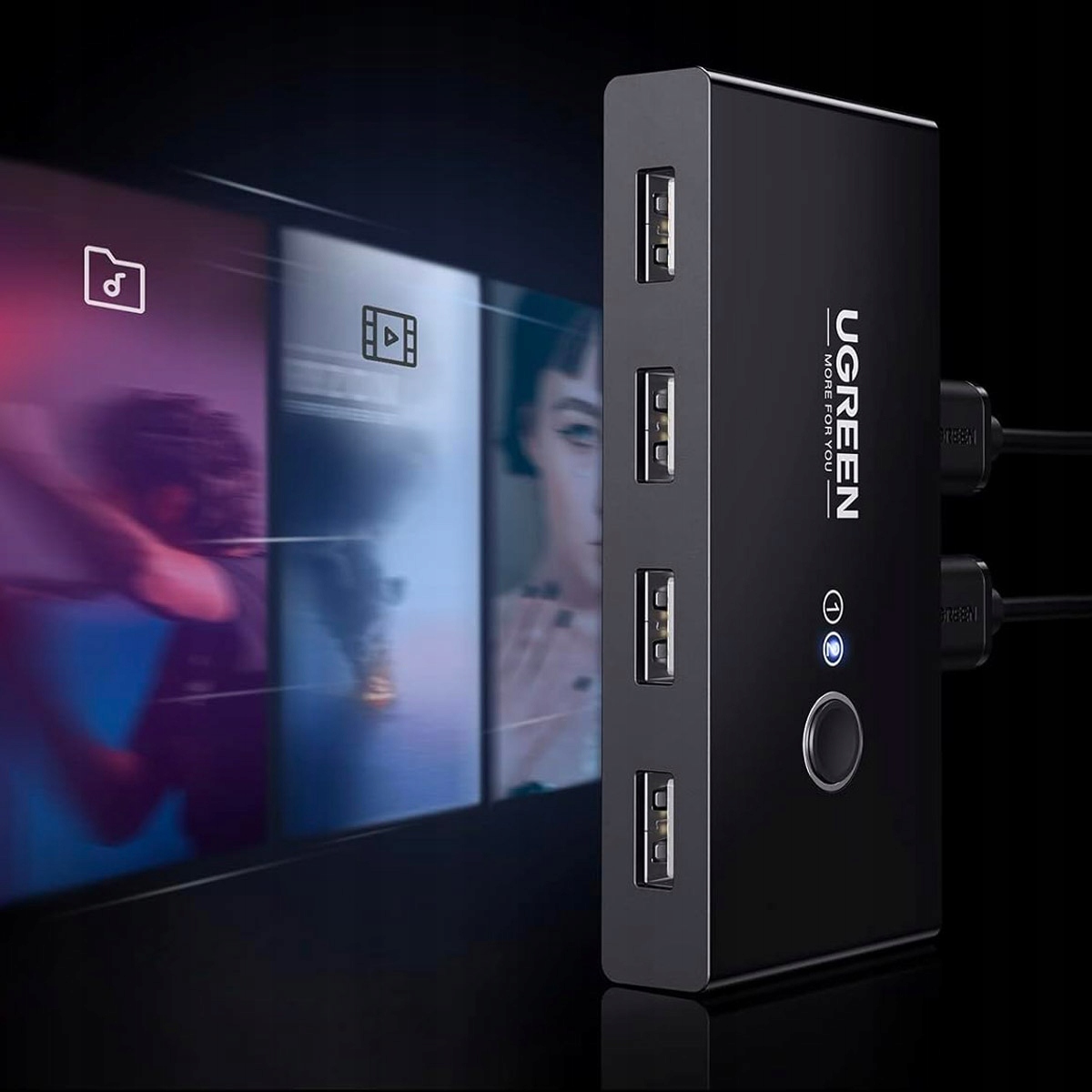 Інтелектуальний USB комутатор Ugreen. Він має 4 входи USB 2.0 і дозволяє підключати два різних пристрої. HUB працює таким чином, що розподіляє доступ до чотирьох USB-портів між двома комп'ютерами. Однак лише один із них може мати доступ до них одночасно. Щоб другий пристрій міг їх використовувати, потрібно перемкнути перемикач на другий пристрій.