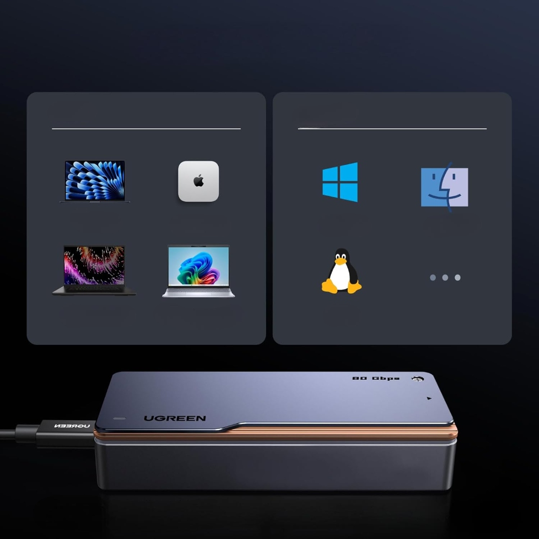 Корпус M.2 NVMe від UGREEN оснащений чіпом Intel Thunderbolt 5, який сумісний із Thunderbolt 5/4 і адаптується до наступного покоління пристроїв, гарантуючи, що технологія не застаріє протягом наступних 3-5 років. Однак футляр несумісний із Thunderbolt 3 і USB Legacy (тобто він несумісний із застарілими протоколами, такими як USB3.2, USB2.0 тощо)