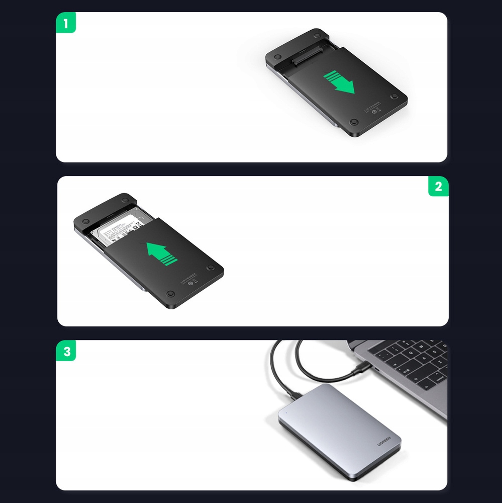 Алюмінієва кишеня Ugreen CM300 дозволить вам швидко та легко перетворити ваш 2,5-дюймовий жорсткий диск на зовнішній накопичувач, готовий до підключення через порт USB Type C. Завдяки міцній конструкції та високій продуктивності ваш накопичувач буде таким отримати друге життя як портативний накопичувач даних.