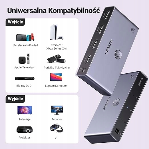 - Універсальна сумісність: HDMI 8K Перемикач підходить для більшості пристроїв зі стандартним інтерфейсом HDMI. Вхід: сумісний із PS5/4, Apple TV, Xbox, Switch, ПК, Blu-ray DVD-програвачем, Sky Q, ноутбуками тощо. Вихід: сумісний із телевізорами високої чіткості, моніторами, проекторами, VR тощо.