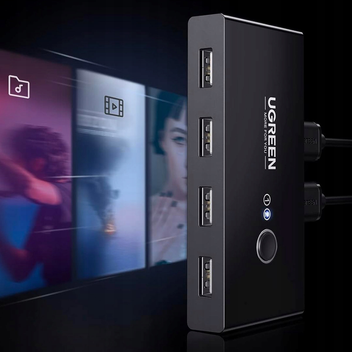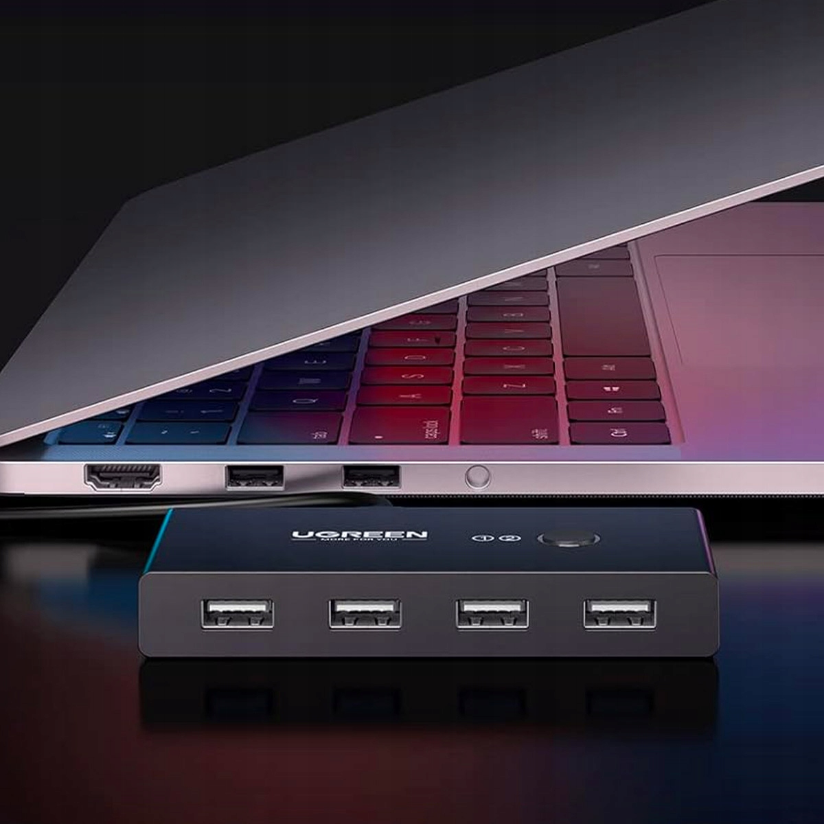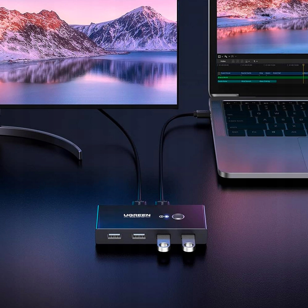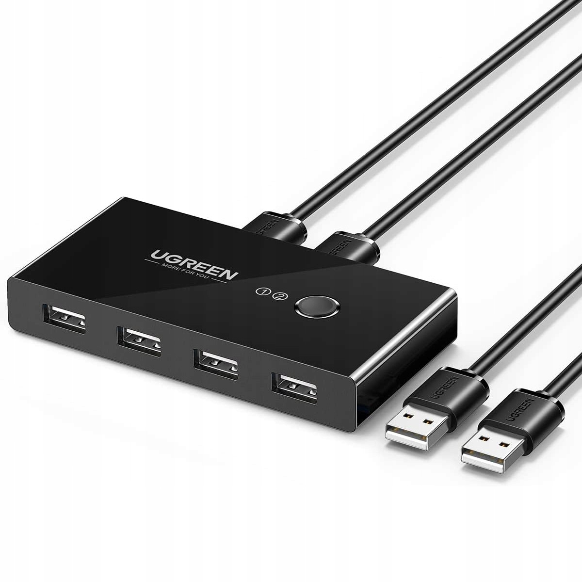 Інтелектуальний USB комутатор Ugreen. Він має 4 входи USB 2.0 і дозволяє підключати два різних пристрої. HUB працює таким чином, що розділяє доступ до чотирьох USB-портів між двома комп’ютерами. Однак лише один із них може мати доступ до них одночасно. Щоб друга машина використовувала їх, потрібно перемкнути перемикач на другий пристрій.