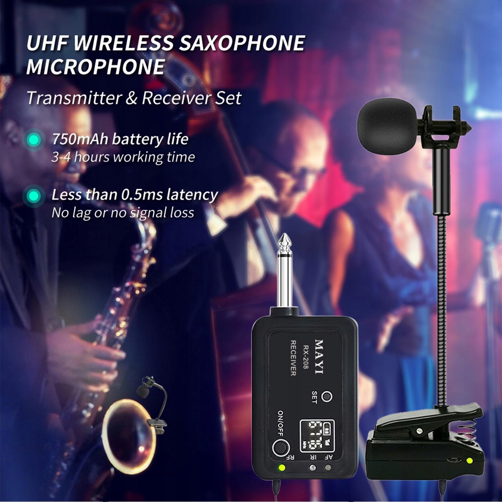 - Система бездротової саксофони може бути використана для електроакустичних інструментів, таких як труба, телефон, тромбон, трубка, евфоніум тощо. Підключіть і грайте, за раз використання.
