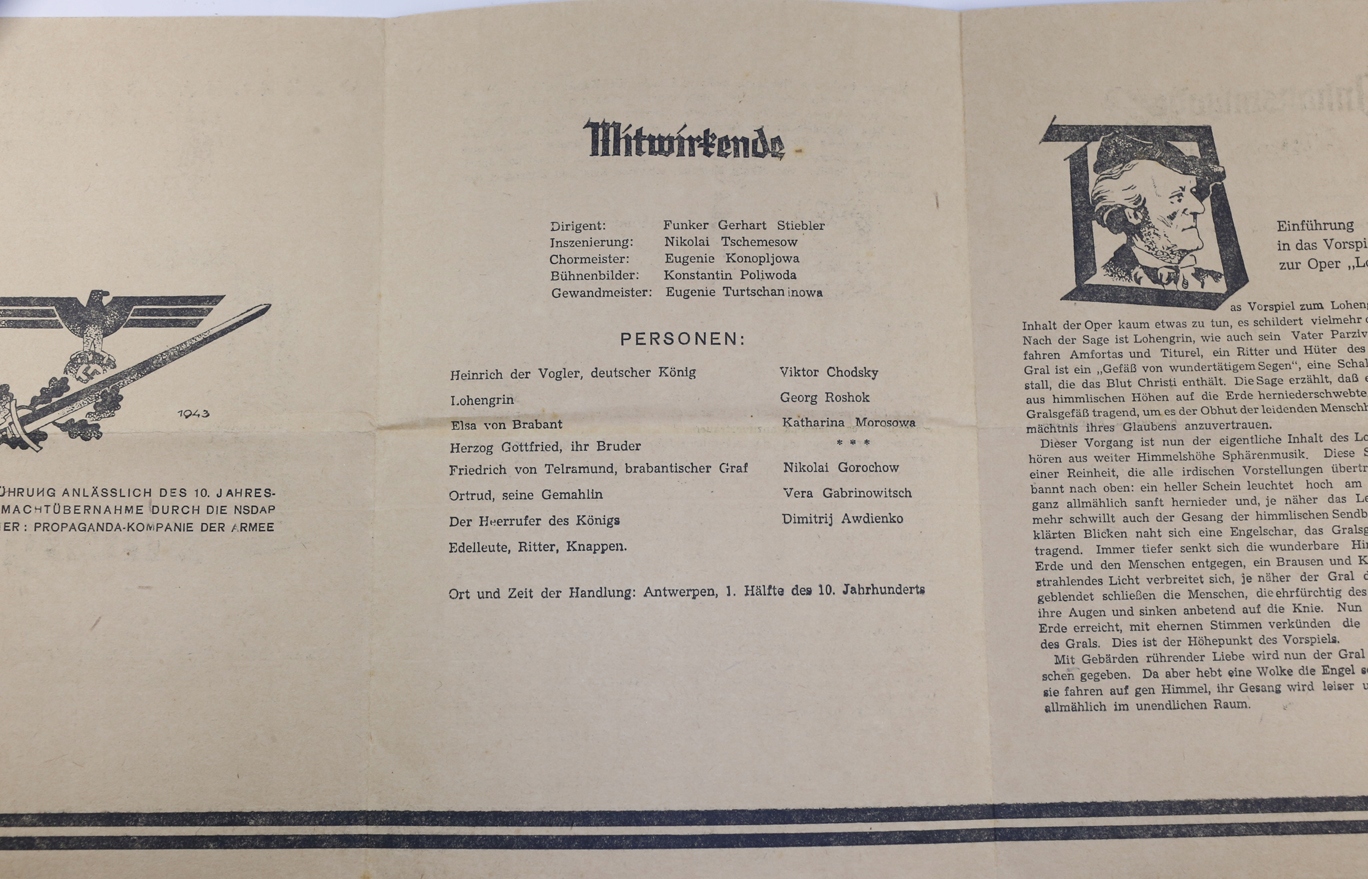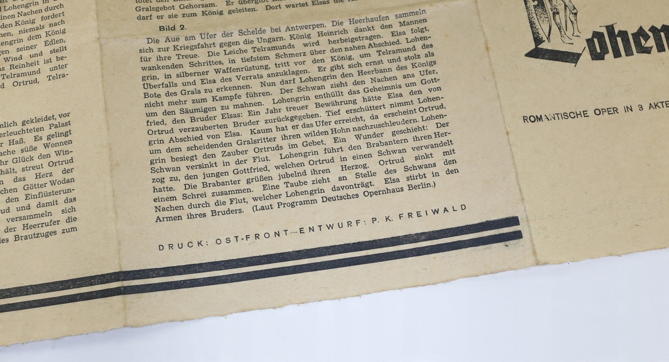 Оригінал надзвичайно цікава, дуже рідкісна німецька військова Програма опери «Лоенгрін» Вагнера, в пропагандистському плані, УКРАЇНА, Харків, Опера, Вермахт 1943 р., формат: у складеному вигляді 24,5 х 16,5 см, у розгорнутому 24,5 х 49 см, дуже хороший стан. Стан добре видно на фото в описі аукціону.