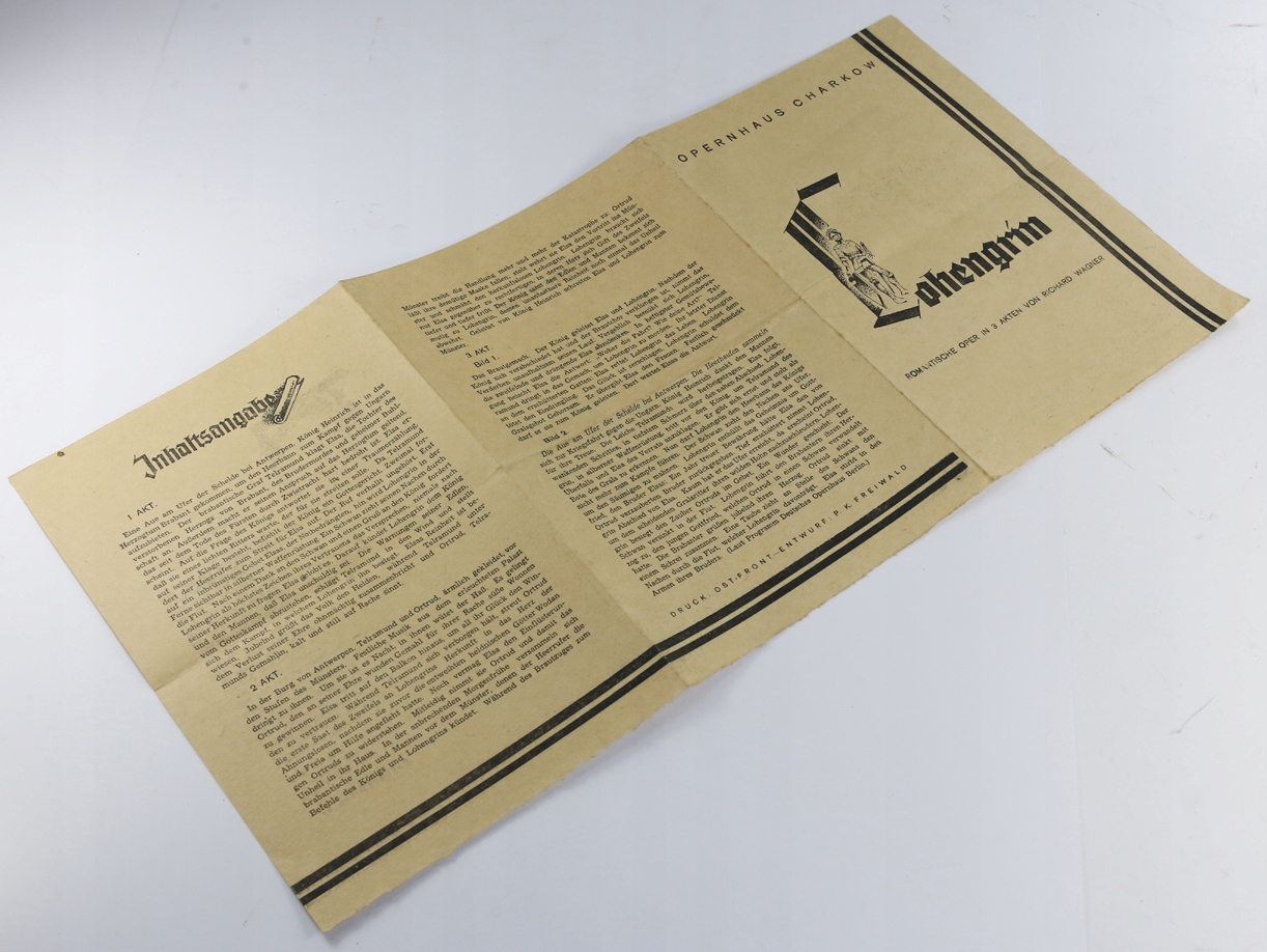 Оригінал надзвичайно цікава, дуже рідкісна німецька військова Програма опери «Лоенгрін» Вагнера, в пропагандистському плані, УКРАЇНА, Харків, Опера, Вермахт 1943 р., формат: у складеному вигляді 24,5 х 16,5 см, у розгорнутому 24,5 х 49 см, дуже хороший стан. Стан добре видно на фото в описі аукціону.