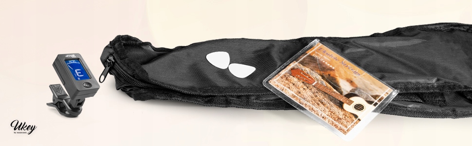 MAX UKEY Укулеле оснащено кількома дуже цікавими аксесуарами. Наприклад, у комплект входить сумка, щоб ви могли легко взяти їх із собою. Цифровий накладний тюнер також включений, тому ви завжди можете налаштувати його, коли це необхідно. Зламана струна? Без проблем! У комплект входить запасний набір струн і 2 медіатори, щоб ви могли продовжувати грати.