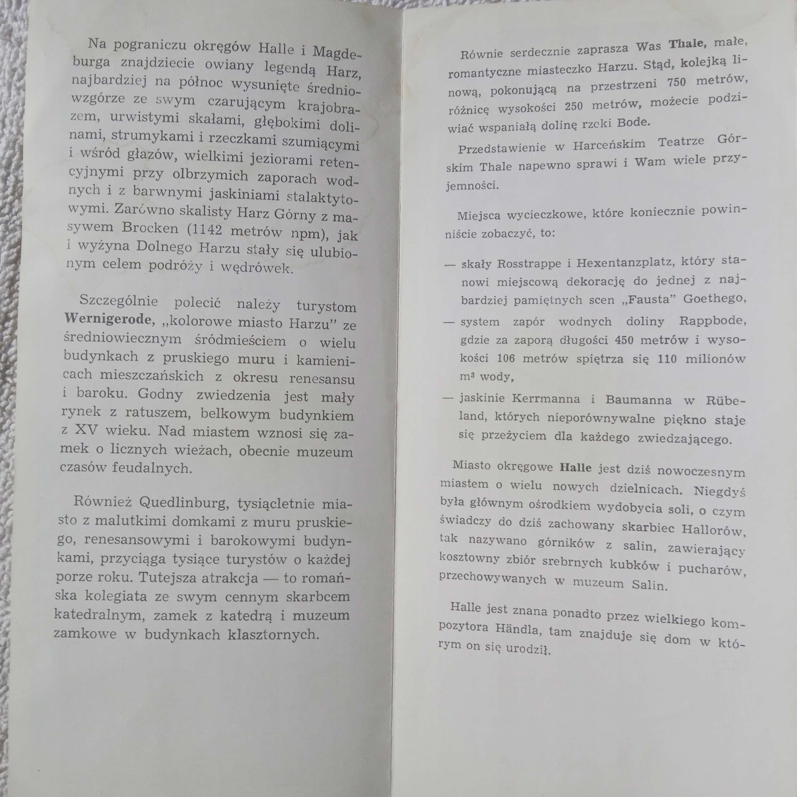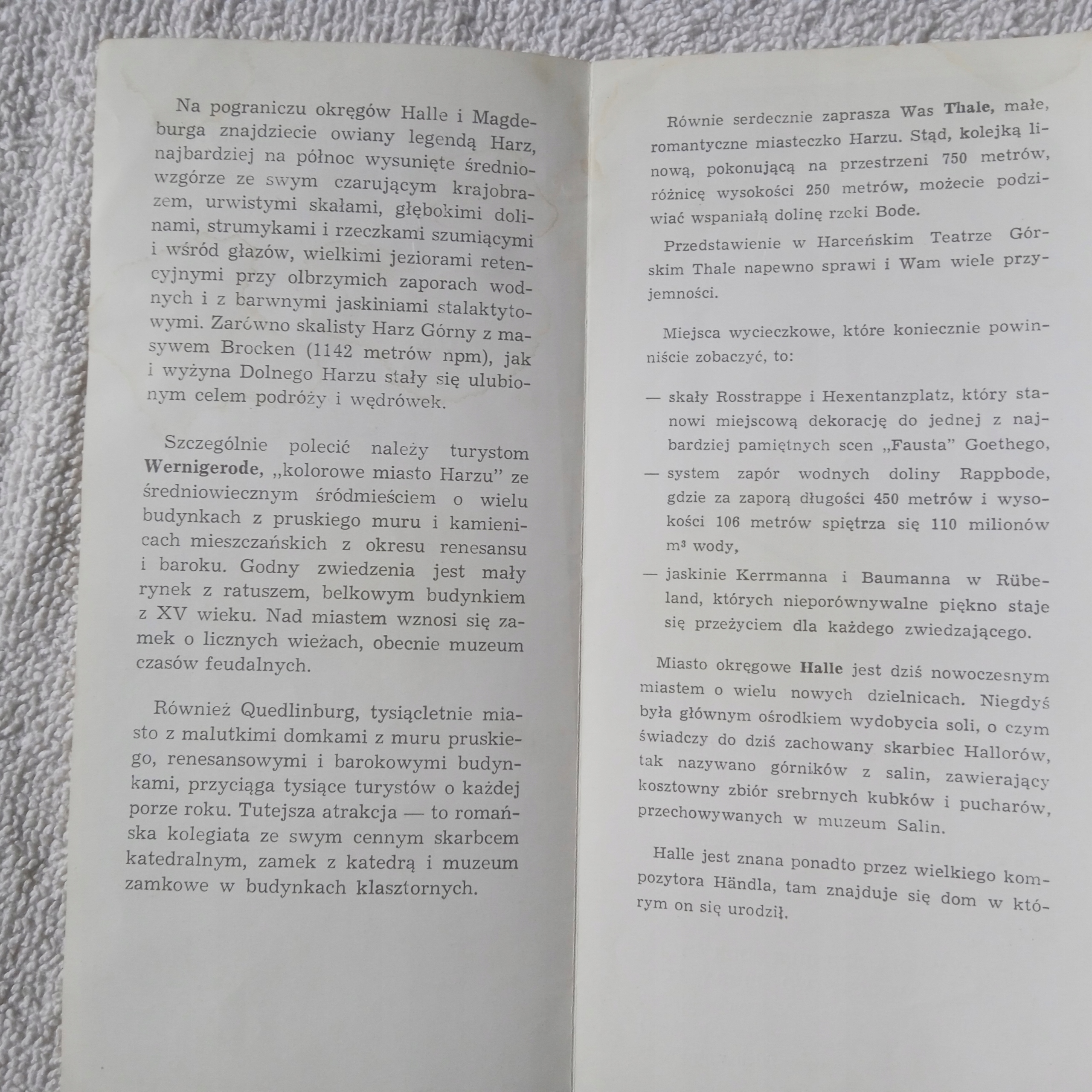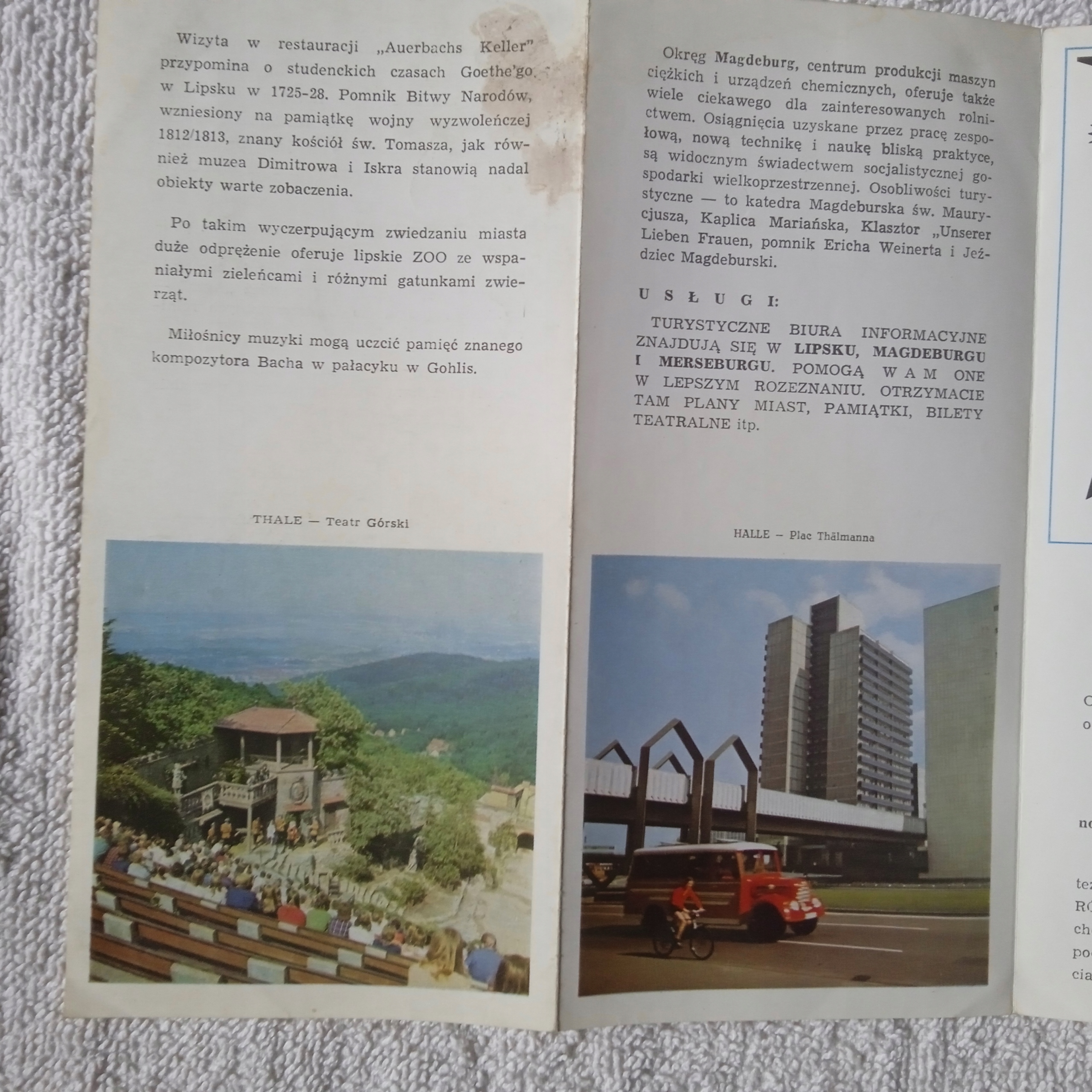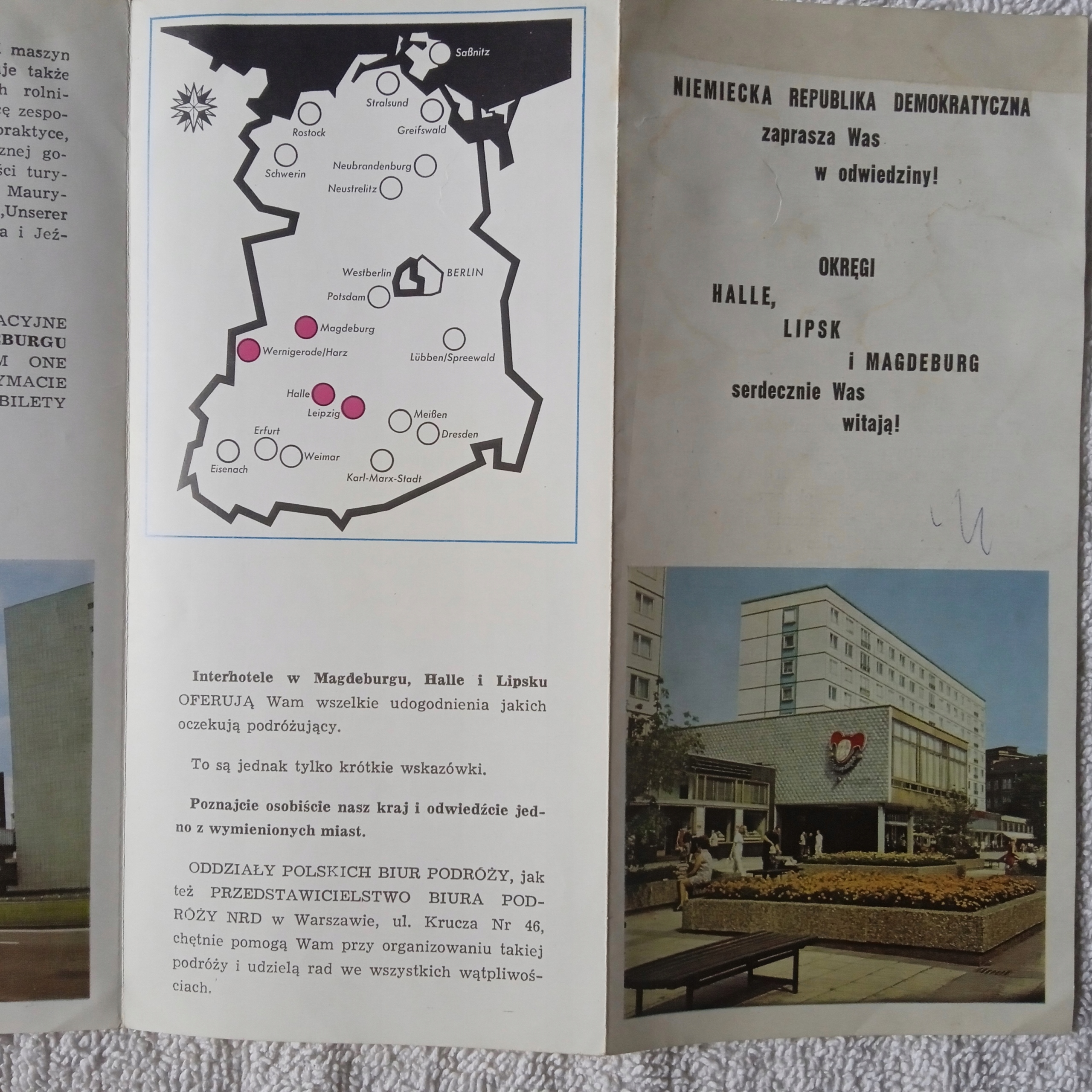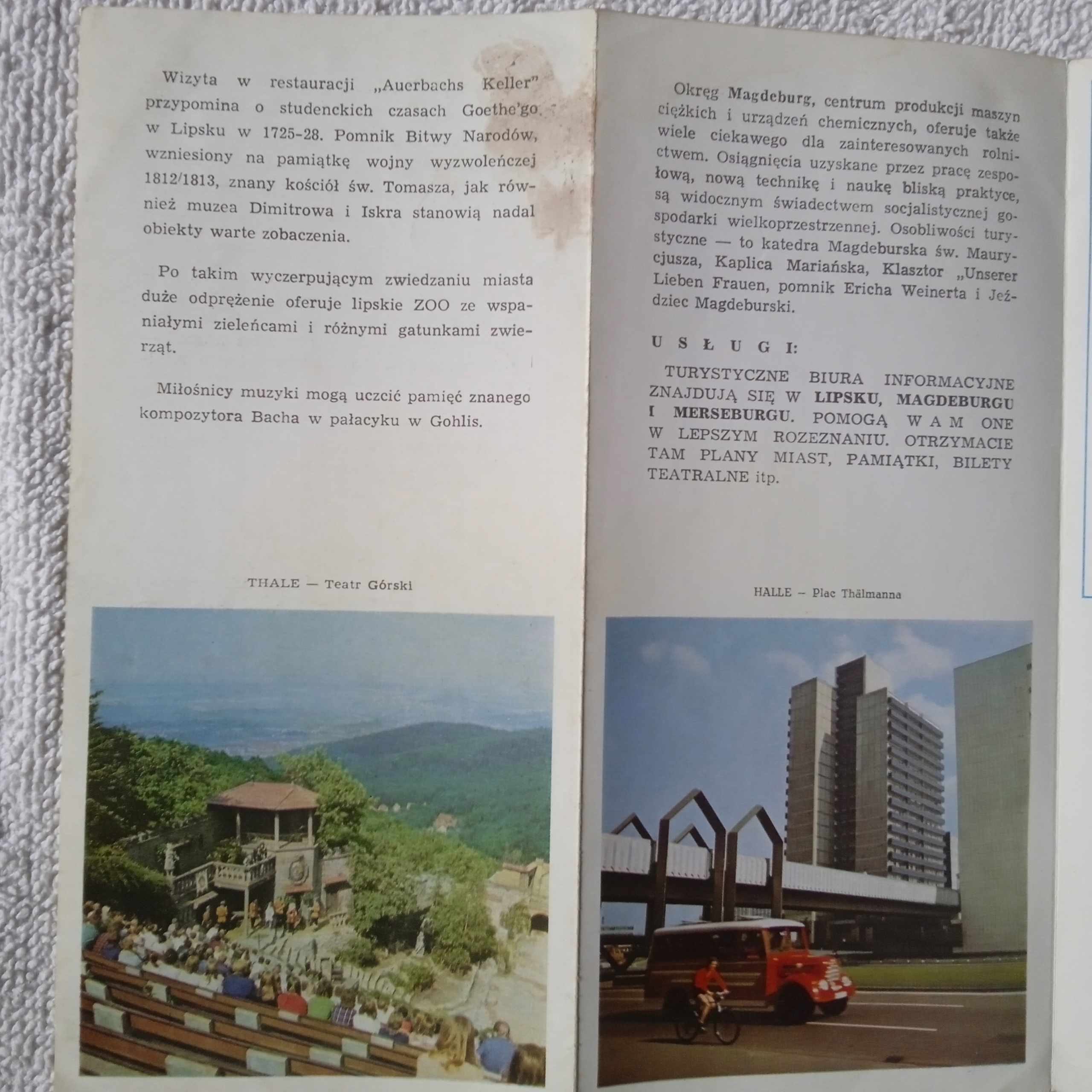 Продається туристична брошура: Німецька Демократична Республіка запрошує вас відвідати! Округи Хаале, Лейпциг і Магдебург гостинно запрошують! Листівка, ймовірно, 1980-х рр. Розміри: 37,8 х 20,2 см, складена гармошкою. На жаль, видавництво та тираж невідомі. У складеному вигляді, брудна, на першій сторінці невеликий "зигзаг", зроблений ручкою. На фото видно реальний стан.