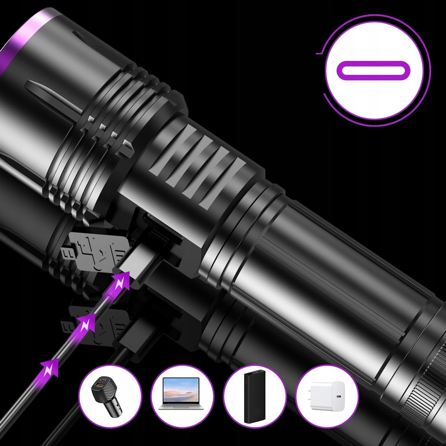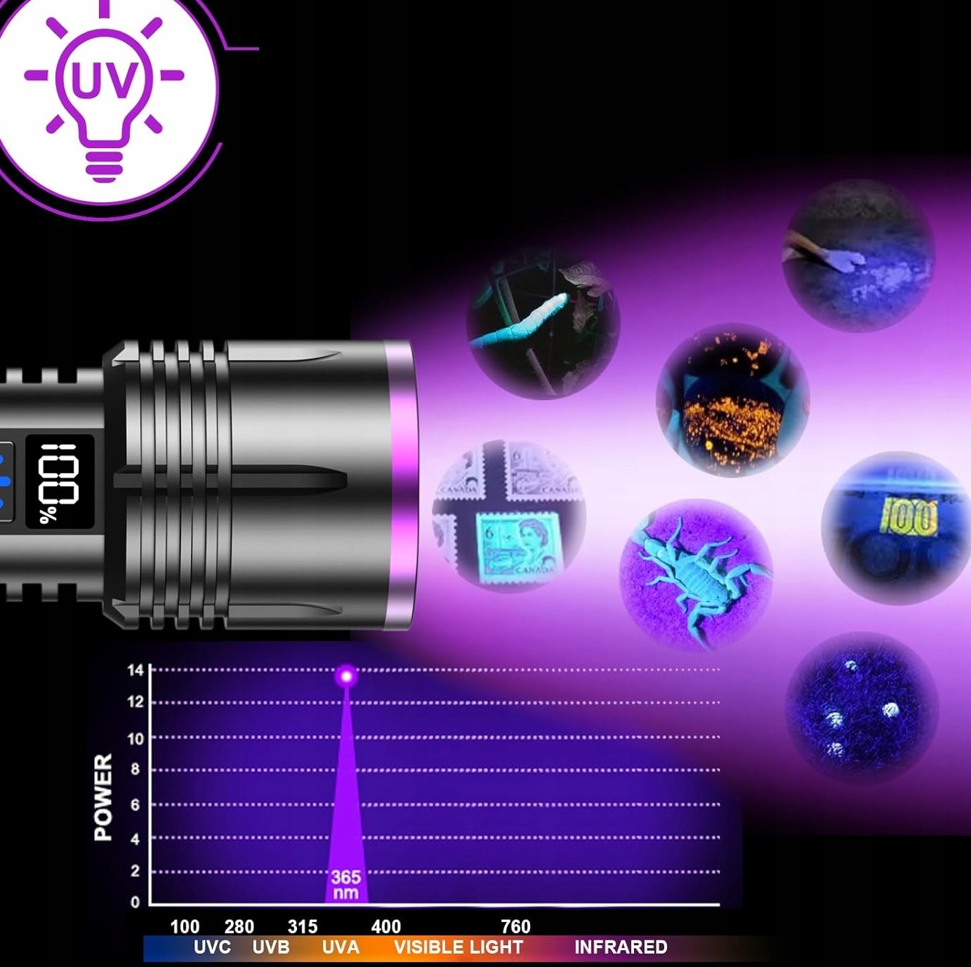 Цей ультрафіолетовий спалах оснащений фільтром ZWB2 та 30 -ватт 4 камінним світлодіодним ультрафіолетом 365 нм з високою потужністю. і сильніший ультрафіолетовий джерело; 365 нм УФ ближче до довжини хвилі збудження багатьох речовин і виробляє флуоресцентний ефект, який достатньо сильний, щоб його побачити, не наближаючись до поверхні предмета.