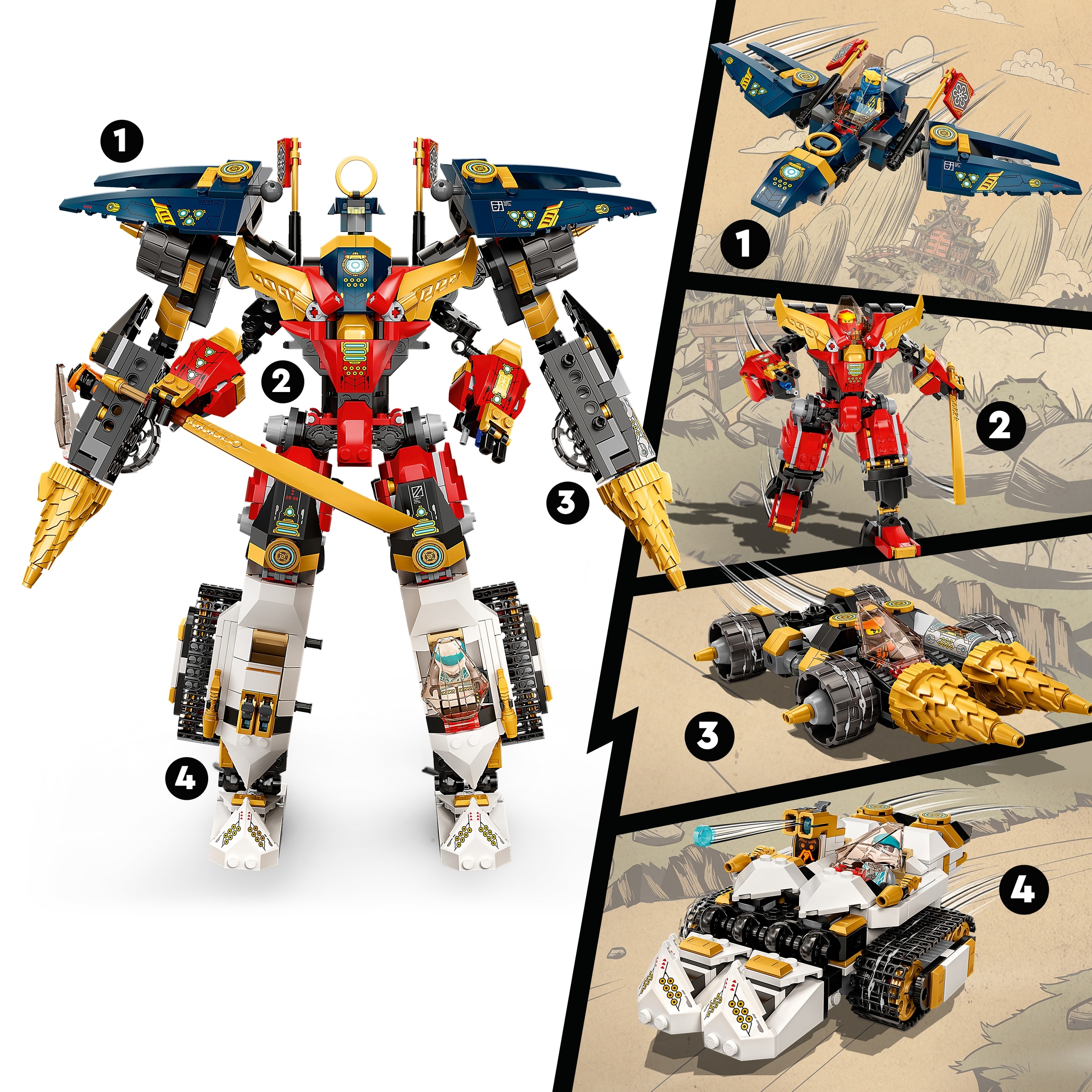 Фантастичний набір транспортних засобів «чотири в одному», який включає меха, танк, реактивний літак і автомобіль, а також сім мініфігурок, завдяки яким шанувальники NINJAGO® зможуть пережити неймовірні пригоди.