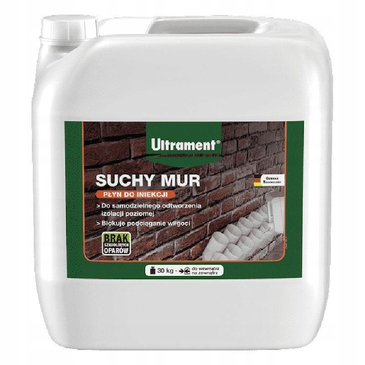 DRY WALL ULTRAMENT використовується для горизонтальної ізоляції в існуючих стінах, блокує відведення вологи через капілярні з’єднання. Капіляри заповнюються рідиною, яка під впливом лужних сполук, що містяться в стінці, починає кристалізуватися, що блокує транспортування води в стінці. Створений таким чином шар являє собою горизонтальну ізоляцію стіни. Але слід пам'ятати, що горизонтальна ізоляція стін від капілярної вологи можлива, якщо загальна вологість не перевищує 70%. Засіб Dry Wall готовий до використання і не містить розчинників. Його можна використовувати на суцільних стінах у підвалах, житлових кімнатах, гаражах, альтанках тощо.