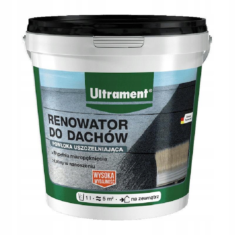 ROOF RENOVATOR - це чорне тонкошарове бітумне покриття, яке використовується для герметизації та відновлення бетонних дахів з фіброцементних плит і руберойду. Завдяки сучасній рецептурі продовжує термін служби покрівельних покриттів, створюючи еластичне ущільнювальне та регенеруюче покриття, стійке до погодних умов, кислот та інших агресивних речовин, що містяться в повітрі. Продукт також можна використовувати для регенерації дерев'яних покрівельних покриттів. Не використовуйте на засмолених поверхнях.