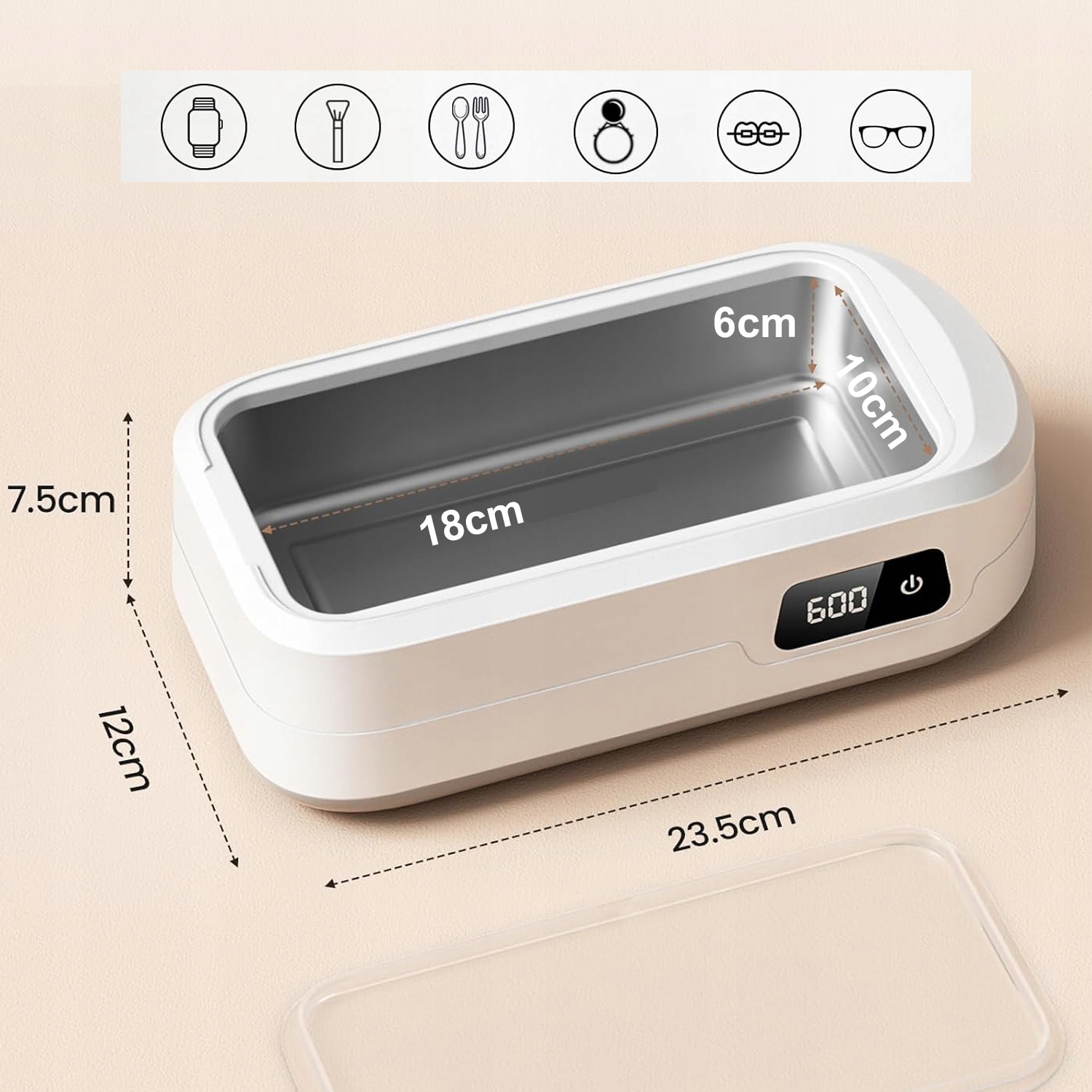 ✅ Висока потужність: резервуар з нержавіючої сталі потужністю 640 мл (18 × 10 × 6 см), придатний для зберігання окулярів, ювелірних виробів, годинників, зубних протезів, протезів зубів, протезів зубів, протезів та інших предметів.