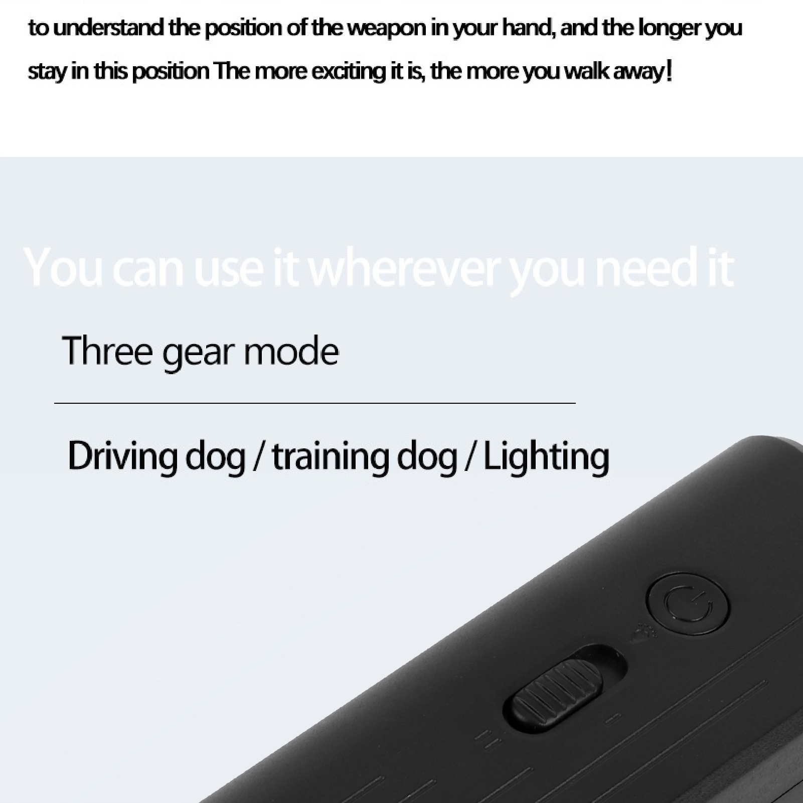 1. Освітлення: Встановіть перемикач передач під продуктом у положенні "Світло", щоб його можна було використовувати як ліхтарики. Навчання собак: Встановіть перемикач передач у нижній частині продукту в положенні "I", натисніть кнопку у верхній частині продукту, щоб переключити машину на викиди ультразвуку. У цей час ви можете навчити свою собаку. Запуск собаку: Встановіть перемикач передач у нижній частині продукту в положенні "II", натисніть кнопку перемикача у верхній частині продукту і використовуйте його проти собаки, і собака щодня тікає. Коли ви зустрінете собаку, яка спробує напасти на вас, ви вийдете цього "посиленого стримування", щоб керувати собакою ультразвуковими хвилями. УЗД стимулює слух собаки. Великі, дуже яскраві миготливі світлодіоди також можуть змусити собаку знати, де знаходиться джерело звуку, і зрозуміти, що ви націлюєте на нього зі зброєю в руці. Чим довше ви залишаєтесь у цьому положенні, тим більше буде стимулювання, і воно швидко зникне!