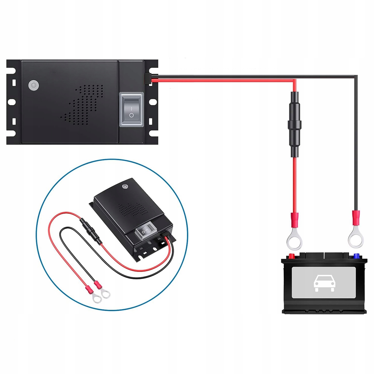 Наш автомобіль автомобіля працює від акумулятора транспортного засобу. Набір включає кріплення кабелів та інструкції з підключення електрода. Пристрій має низьке споживання енергії, тому він не обтяжує акумулятор.