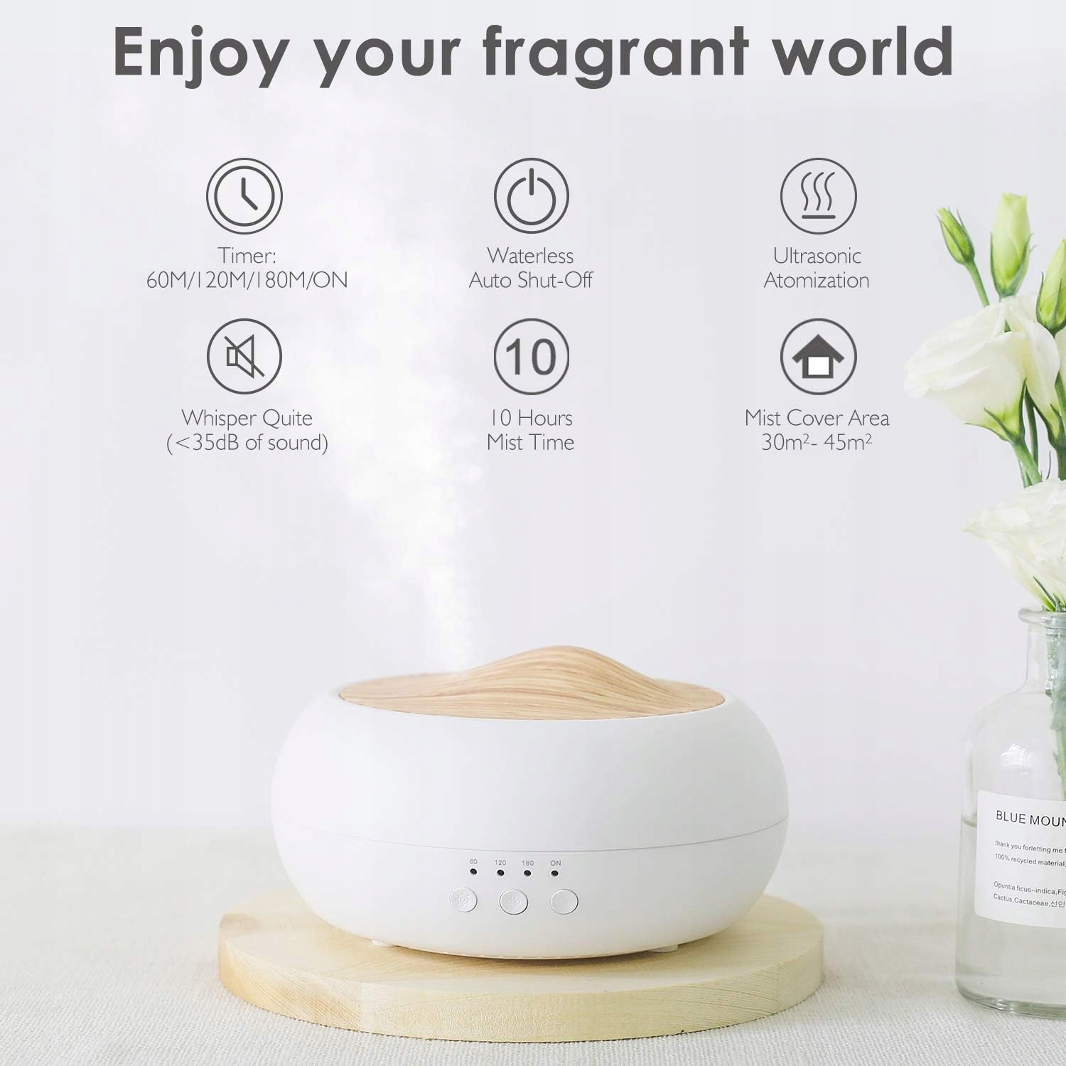【Тиха ультразвукова робота】: завдяки передовій технології дифузор ефірних олій дуже тихий під час роботи. Створює дуже делікатний туман, покращує стан сухої шкіри та дарує приємний аромат. Примітка: якщо вода додається вище максимального рівня лінії, туман буде незначним або зовсім відсутнім. Додайте 2-3 краплі ефірних масел. Якщо додати більше крапель, суцільного туману не буде.