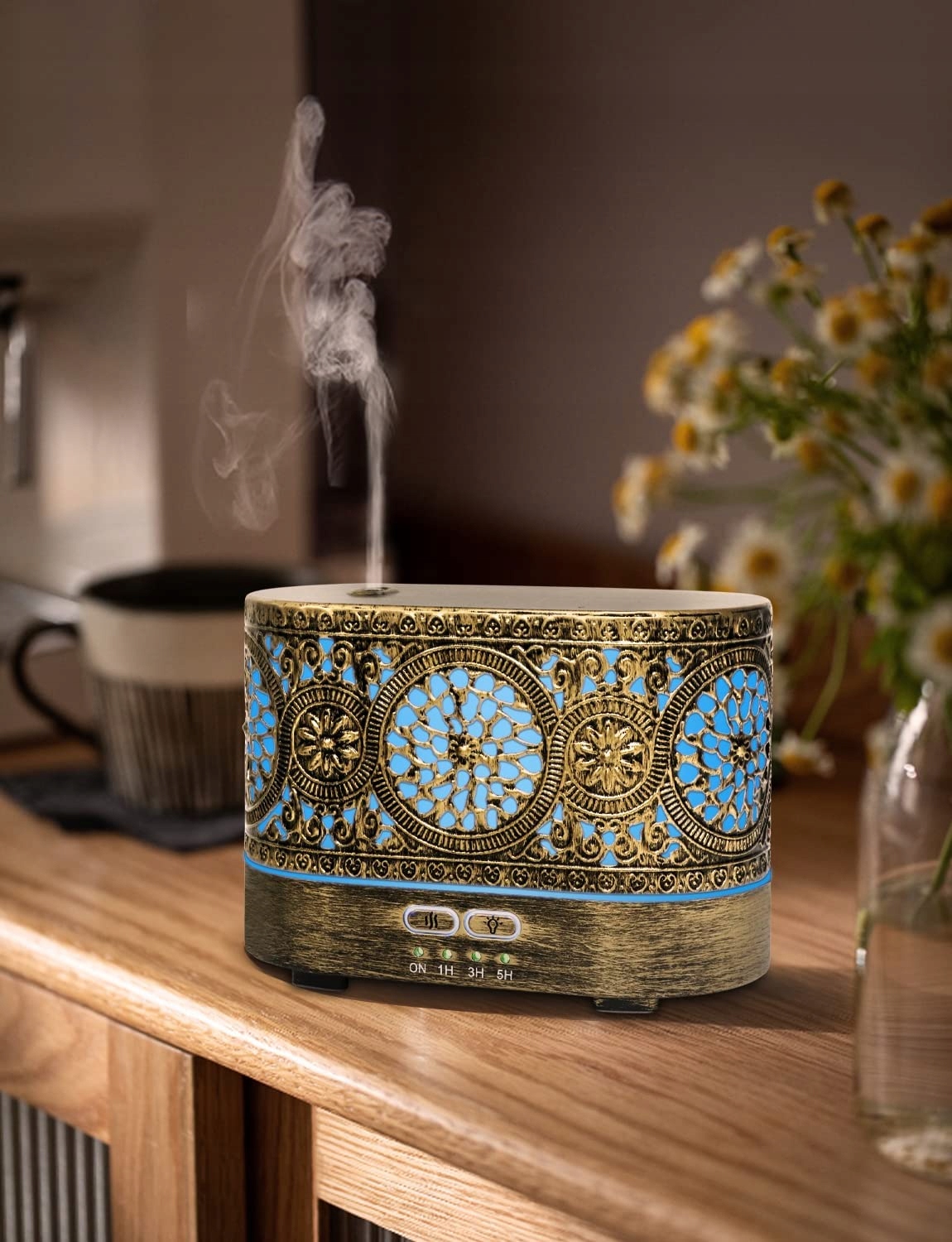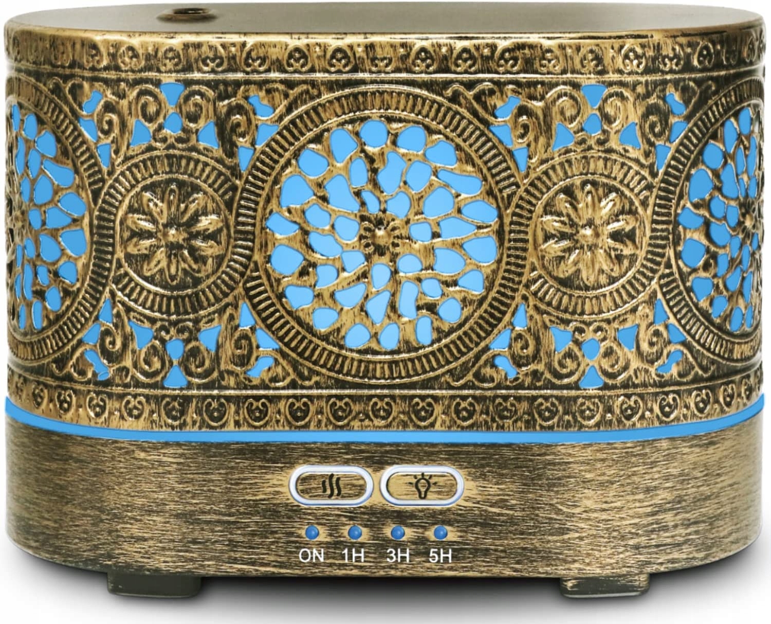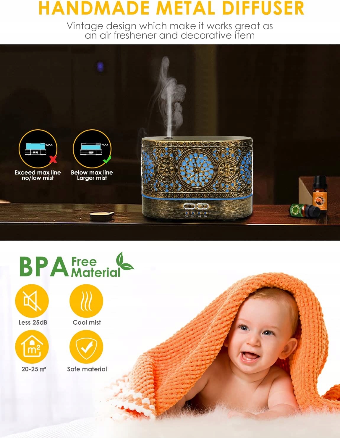 Металевий дифузор ефірних олій - дифузори SALKING для ефірних олій із зображенням золотого заліза, цей класичний дифузор стане ідеальним доповненням до аромату та стилю вашого дому. Завдяки ароматам ваших улюблених ефірних олій, він ніжно розподіляє пару, просочену ефірними оліями, у вашому просторі, надаючи вашому інтер’єру відчуття розкішного комфорту. ✅ 7 різнокольорових лампочок і таймер - дифузор ефірних олій має 4 режими налаштування часу: УВІМК/1Г/3Г/5Г. Натисніть кнопку освітлення масляного дифузора, щоб вибрати потрібний колір, ви також можете ввімкнути режим автоматичного освітлення, щоб розслабитися, або вимкнути все освітлення для повної темряви. Тонкий прохолодний туман вивільняє ароматні властивості по всьому повітрю, а кольорове світлодіодне світло допомагає створити бажану атмосферу. ✅ Автоматичне вимкнення без вмісту бісфенолу А та без води - зволожувач холодного туману використовує ті самі безпечні та екологічно чисті матеріали ПП, які використовуються для виготовлення дитячих пляшечок, які не містять бісфенолу А. Коли в масляному дифузорі закінчується вода, наші датчики автоматично вимикають дифузор, щоб ви могли бути спокійні. Цей ароматерапевтичний дифузор перетворює воду та ефірні олії в ароматний туман до 15 годин завдяки резервуару для води об’ємом 300 мл. ✅ Романтичний домашній декор та ідеї для подарунків - Прикрасьте будь-який простір і покращте атмосферу за допомогою наших дивовижних ароматерапевтичних дифузорів. Кольорове світло з додатковим ефектом свічки та дивовижний унікальний дизайн епохи Відродження створить романтичну атмосферу в будь-якому просторі. Це також ідеальний подарунок на день народження, різдвяний подарунок для друга чи сім’ї, його можна використовувати як ароматерапевтичний дифузор / зволожувач повітря / очищувач повітря / нічник.