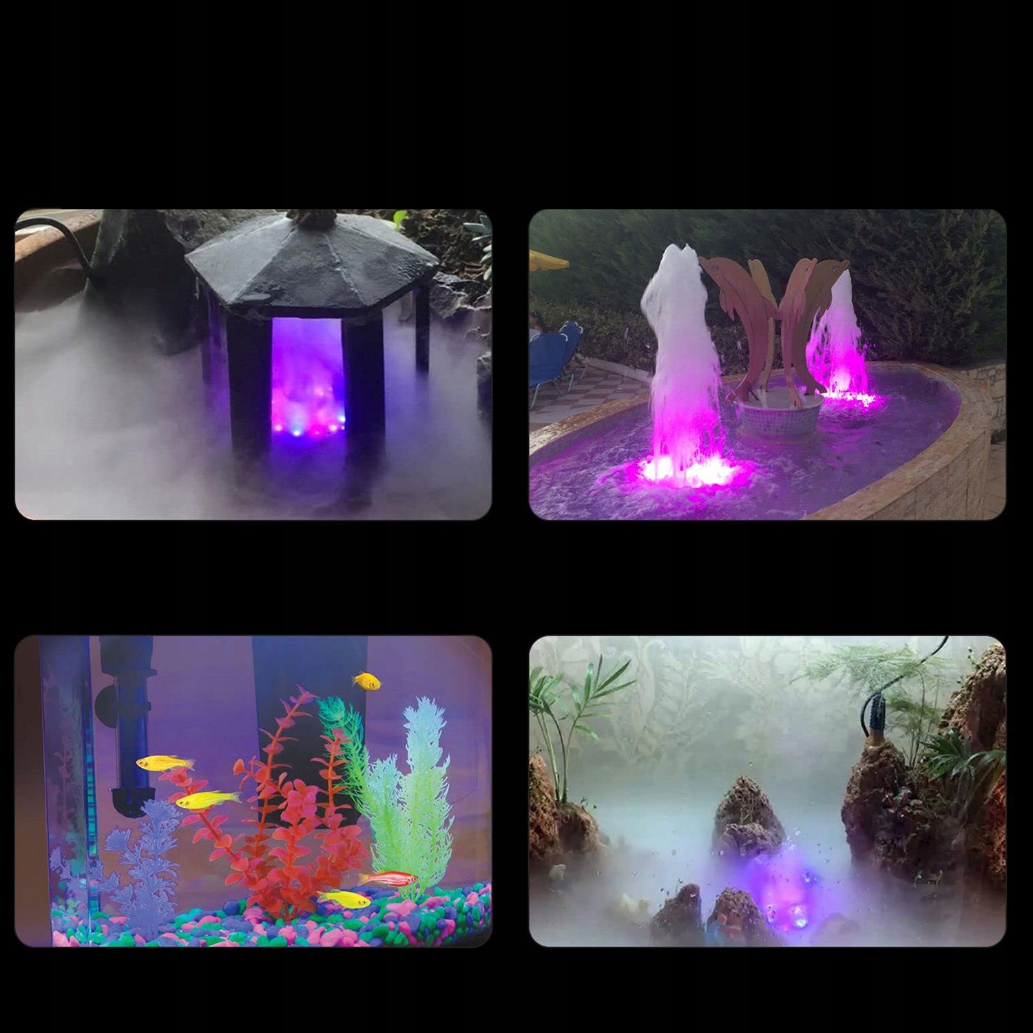 - Натуральний ефект туману: Створіть у своєму саду прекрасний, щільний туманний ефект, генеруючи природний туман з поверхні води. Це не тільки збільшує вологість повітря, але й допомагає зменшити пил, забезпечуючи освіжаюче та приємне середовище. Насолоджуйтесь красою природи! 4 Нехай гіпнотизуючі кольори створюють магічну та захоплюючу атмосферу, збільшуючи візуальну привабливість водного простору. Пориньте себе у чудовий світ!