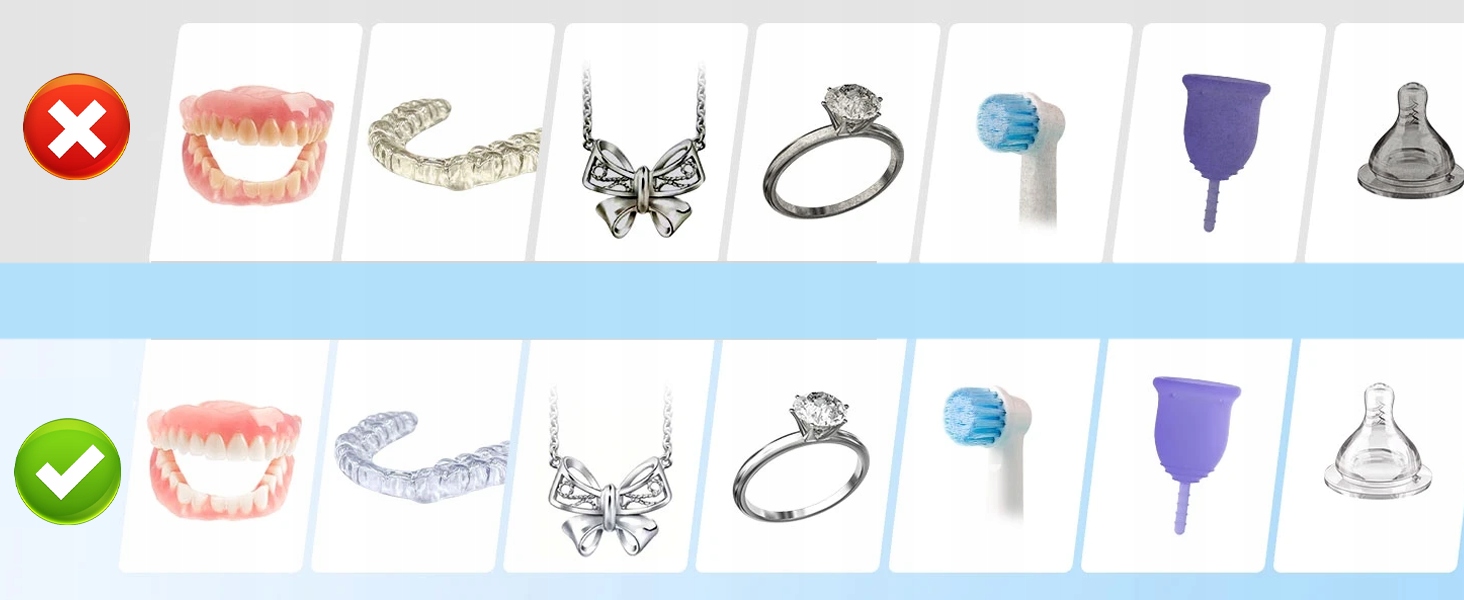 - Пристрій для чищення використовує ультразвукові хвилі з частотою 42-45 кГц, щоб проникати в щілини та порожнини, ефективно видаляючи частки з зубних протезів, брекетів, відбілюючих лотків, щитків для зубів, насадок для зубних щіток і навіть ювелірних виробів. У поєднанні з ультрафіолетовим світлом робить речі блискучими та гігієнічними.
