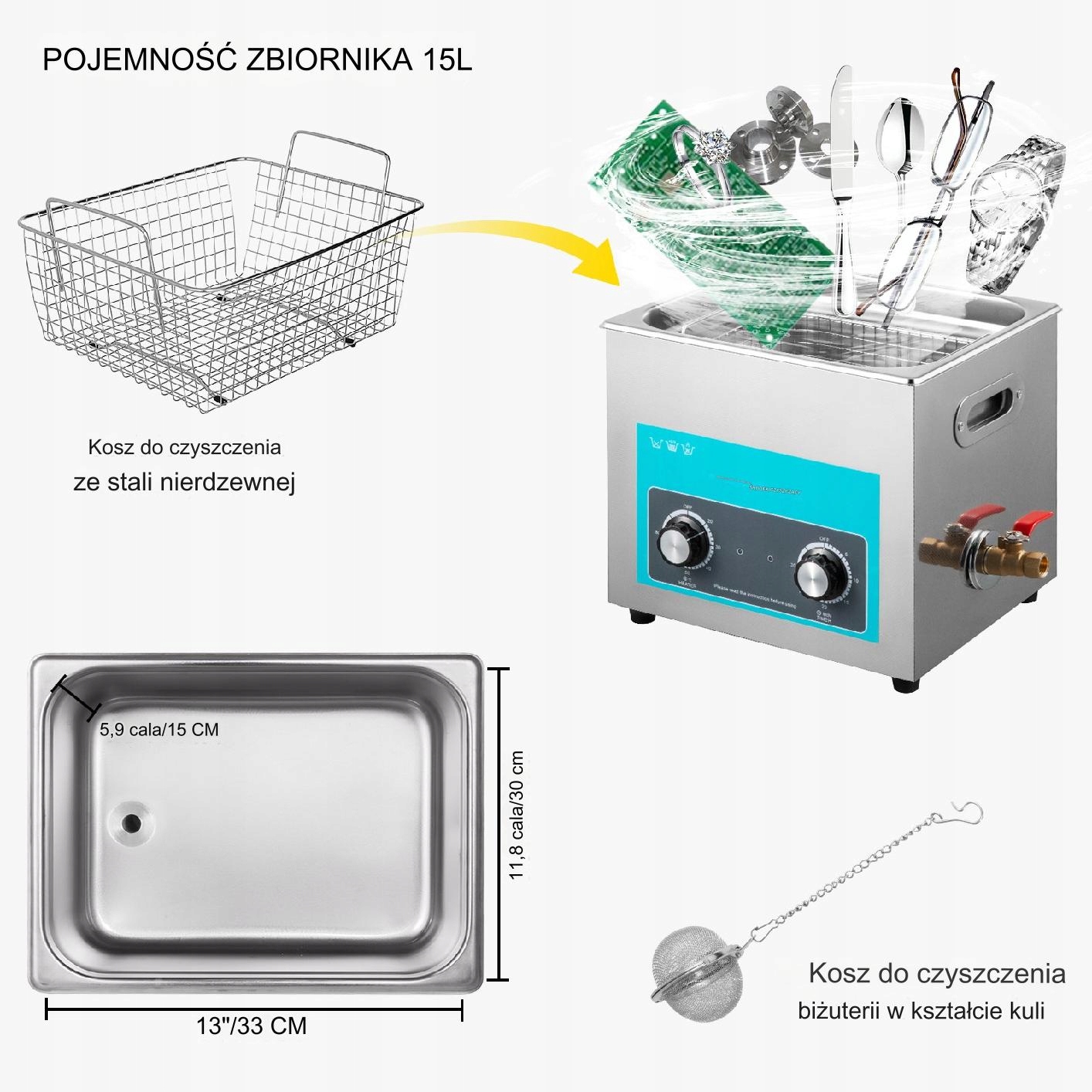 Бак на 15 літрів з великим кошиком з нержавіючої сталі. Для генерального чищення використовуйте водопровідну воду, додавши 5-10 мл миючого засобу для кращого результату прання ювелірних виробів.