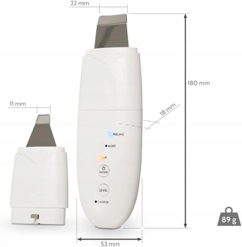 - точка: ультразвуковий пілінг обличчя, який омолоджує та очищає шкіру. Допомагає отримати омолоджене, яскраве та чисте обличчя. Результати помітні з першого сеансу. Насолоджуйтесь м’якшою та омолодженою шкірою в комфорті свого дому. Два змінних шпателя різних розмірів для різних частин обличчя