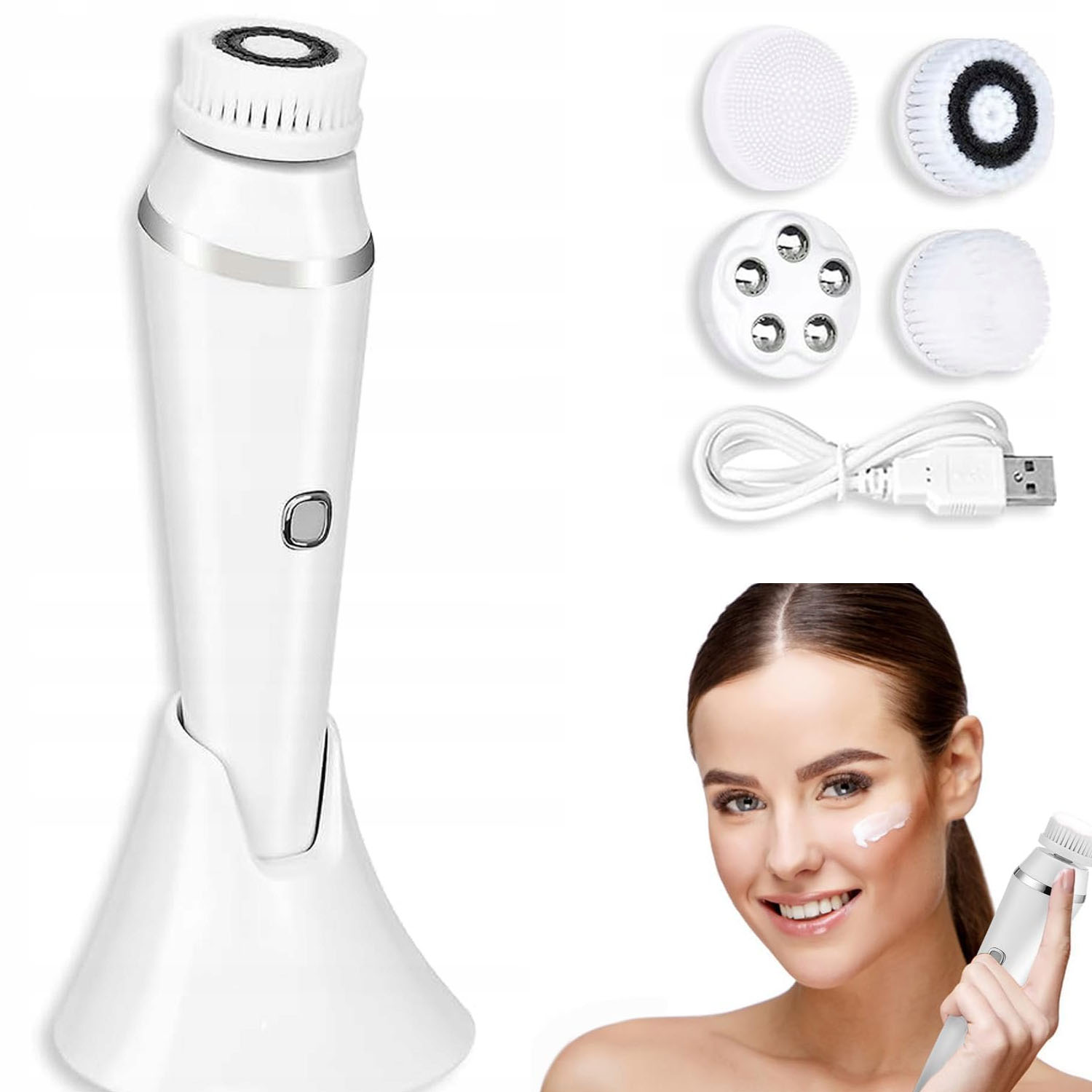Наша щітка для очищення обличчя оснащена чотирма різними кінчиками пензля - довгою щетиною головою, головою з короткою щетиною, силіконовою головою та масажними намистинами.