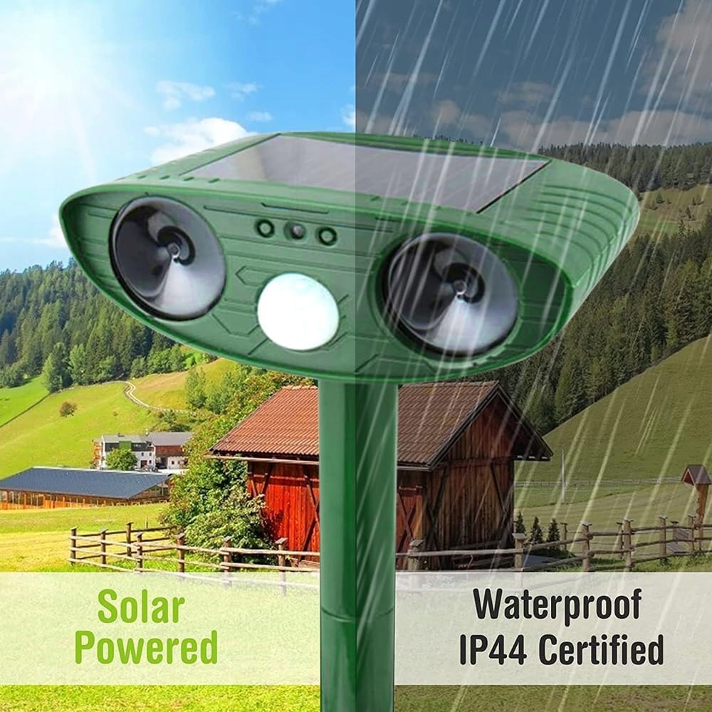 Сонячна ультразвукова тварина Покаяння використовує водонепроникну структуру ip44 , що не впливає на негоду. У верхній частині є сонячна панель для збору сонячної енергії. Продукт може бути ефективно заряджається вдень у сонячному місці, тому він не буде пошкоджений, він все ще може працювати вночі. Зовні вам не потрібно турбуватися, що продукту потрібна розетка, і повна плата може тривати 4-6 днів.