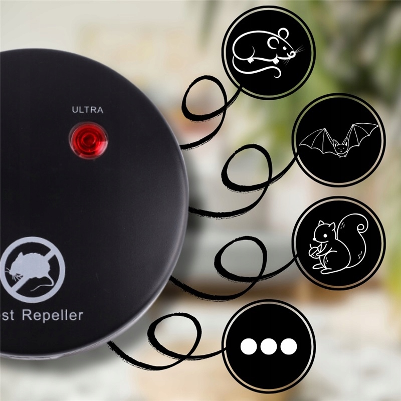Звук, що виробляється пристроєм, може ефективно відлякувати гризуни, такі як щури, щури, марени, ласки, білки тощо, ідеально підходячи для використання в обмежених місцях, таких як будинки, підвалів, гаражі або робочі місця. Продукт виробляє ультразвукові хвилі з частотною конверсією, що ефективно стримує шкідників. Він оснащений багатьма режимами, динаміком, що випромінює ультразвукові хвилі та хвилі, що генерують тиск, що генерує. Пристрій має активну робочу поверхню до 150 м².