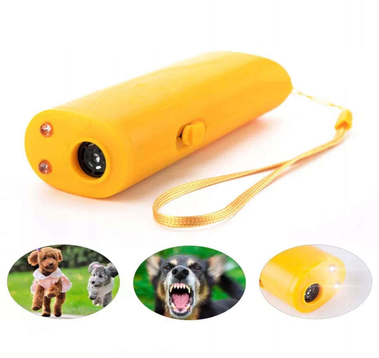 Відлякувач собак – це пристрій, який випромінює інтенсивний ультразвуковий сигнал, ефективно відлякуючи агресивних собак. Відлякувач випромінює хвилі високої частоти (20 000-40 000 Гц), які не чутні людським вухом і вкрай неприємні для собак та інших диких тварин. Електронний тренажер використовується для випромінювання ультразвукових хвиль, які чують собаки, які знаходяться на відстані приблизно до 7 м.