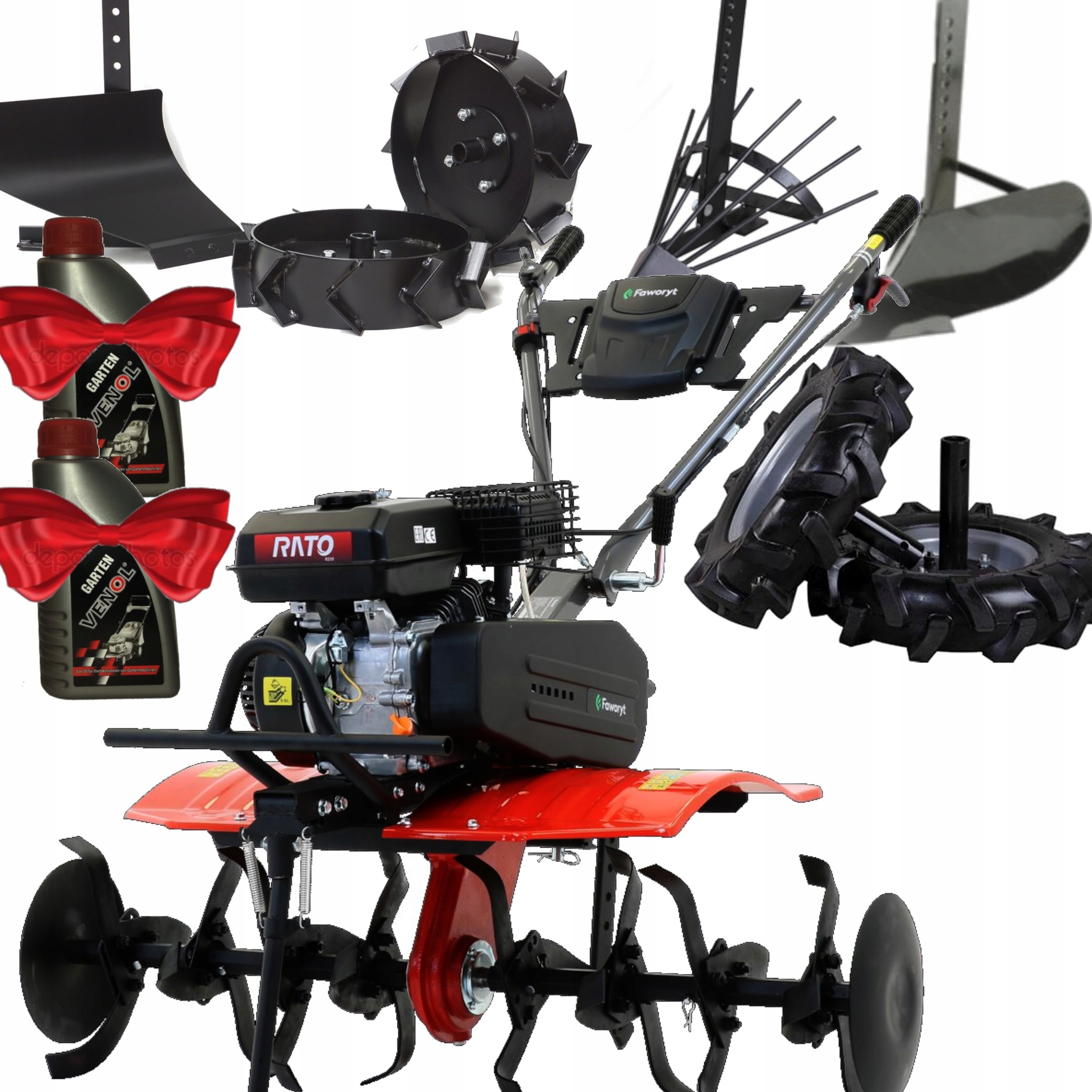 FAWORYT RT212R + гумові колеса + металеві колеса + бокові диски + окучник + плуг + копалка + 2x моторна олива
