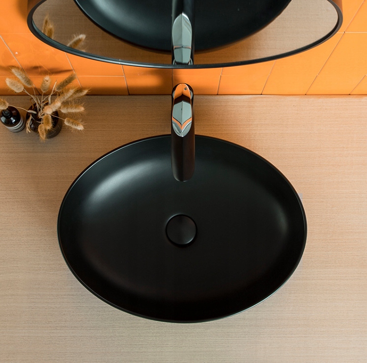 УМИВАЛЬНИК КЕРАМІЧНИЙ НАСТІЛЬНИЙ, ЧОРНИЙ МАТОВИЙ, 41x33 см, РОЗМІЩЕНИЙ НА ОВАЛЬНІЙ СТІЛЬНІ
