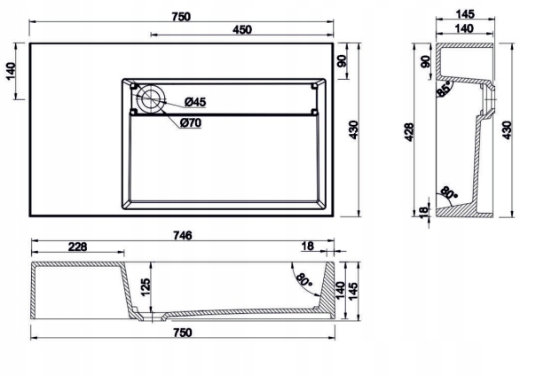 Умивальник призначений для встановлення на стільницю або тумбу. Також є отвори для підвішування на стіну.