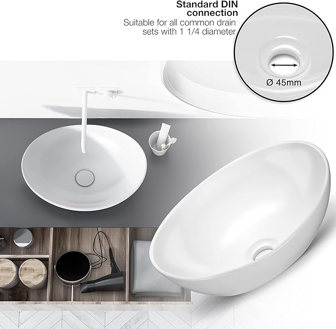 - УНІКАЛЬНИЙ ТА СВОЄЧАСНИЙ ДИЗАЙН - Ексклюзивний дизайн елегантної овальної форми помітно покращує вашу ванну кімнату та пропонує як вам, так і вашим гостям чудовий вид кожного разу, коли ви її використовуєте. Завдяки позачасовому зовнішньому вигляду його можна вставити в будь-який тип ванної кімнати та таким чином гармонізувати зі стилем обладнання, яке ви обрали або оберете в майбутньому.
