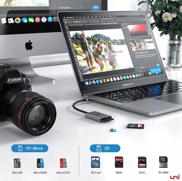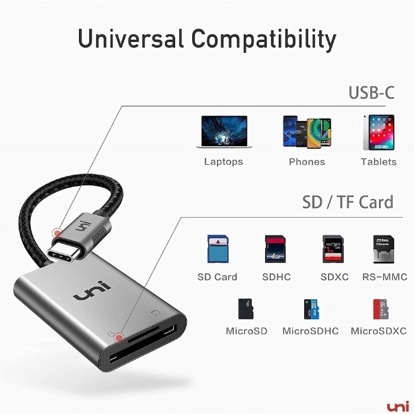 - Подвійна швидка передача даних зі швидкістю 5 Гбіт/с: привітайтеся з неймовірною швидкістю передачі даних (до 5 Гбіт/с) за допомогою нового порту USB C і повністю насолоджуйтеся швидкістю передачі даних у режимі UHS-I. Сумісний з USB 2.0/1.1. Подвійні слоти для карт, сумісні з картами SD, SDHC, SDXC, MicroSD, MicroSDHC, MicroSDXC. Примітка. Фактична швидкість читання SD-карти залежить від пристрою.