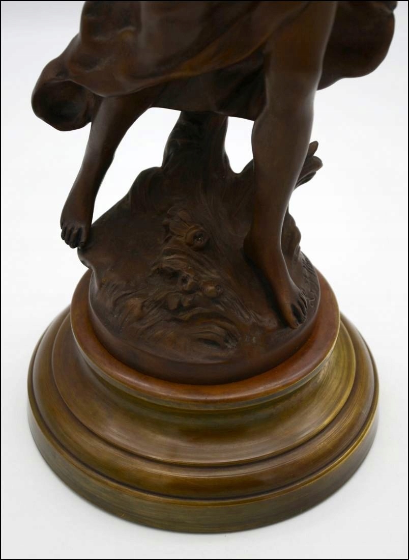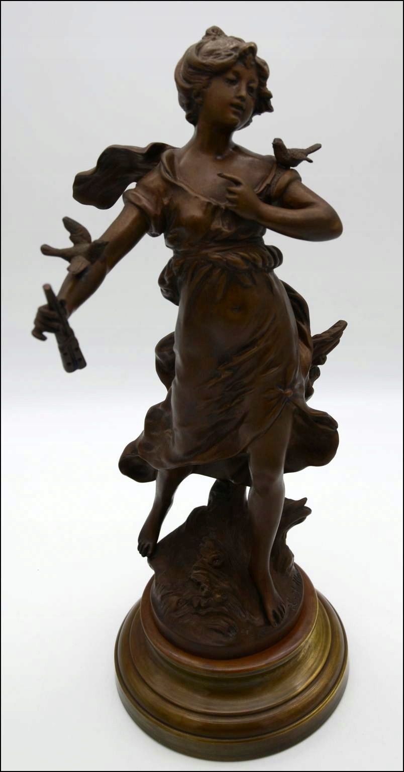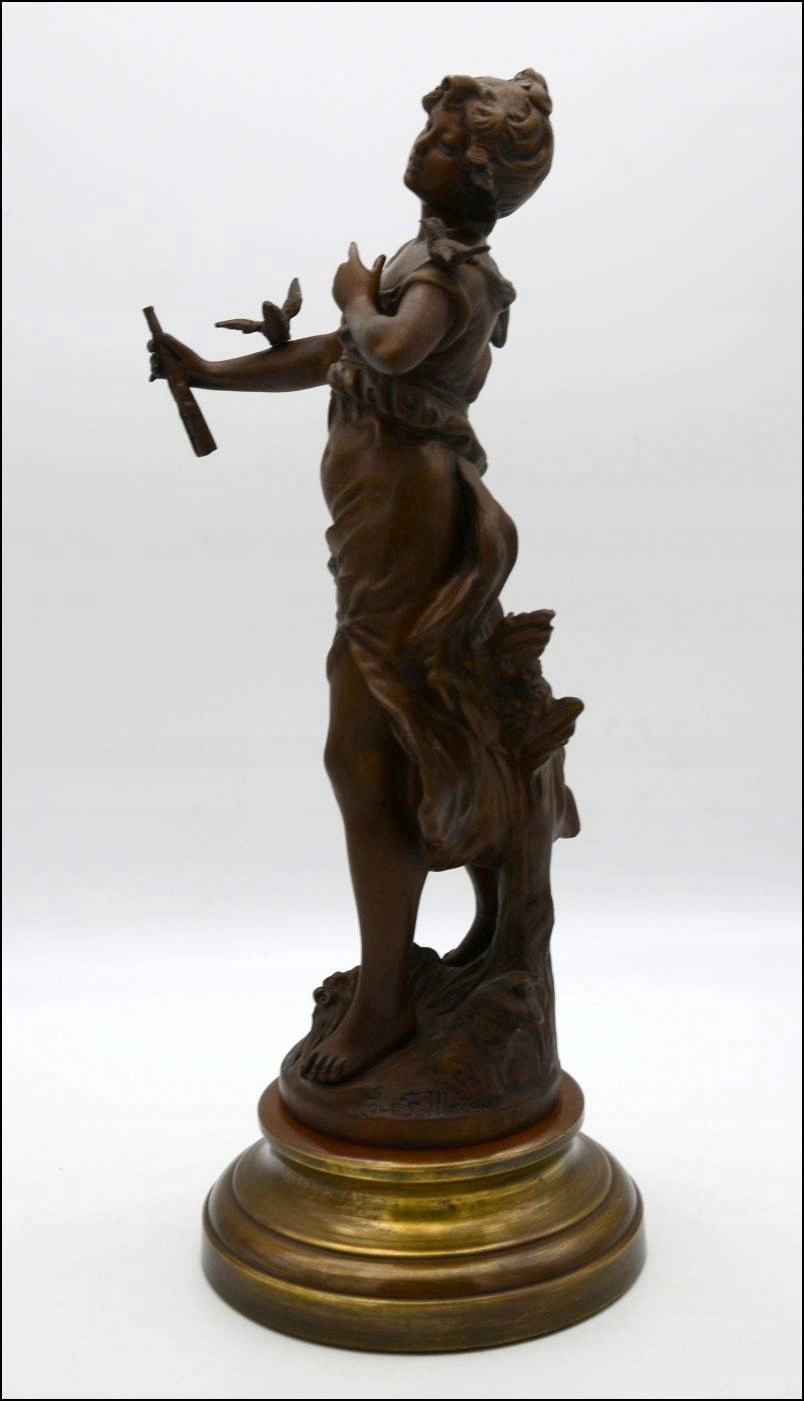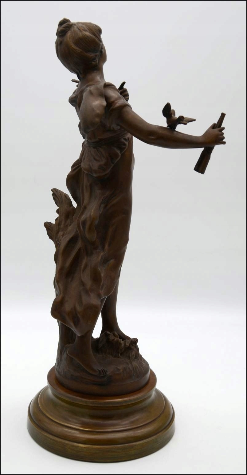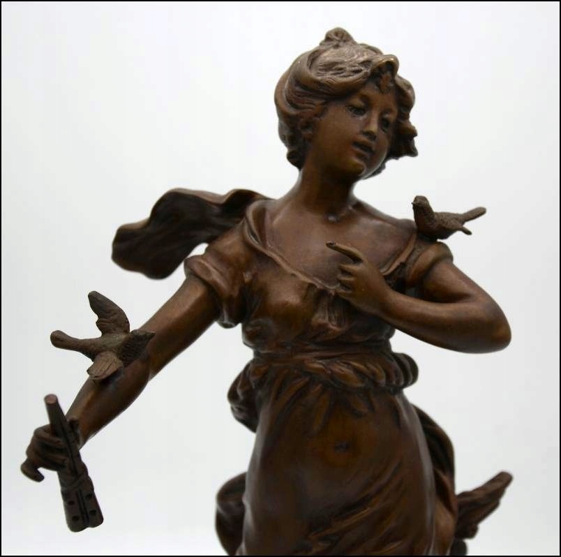 Предметом аукціону є чудова бронзова фігурапідписана автором Л. Ф. Моро і походить із періоду модерну. Виріб виготовлено з бронзової жерсті. Кожна найменша деталь виконана дуже точно. Фігура стоїть на міцній красивій основі і показує жіночу фігуру в супроводі птахів. Фігура ідеальна! Ідеальна прикраса для вітальні - ніхто не пройде повз нього байдужим!!!!