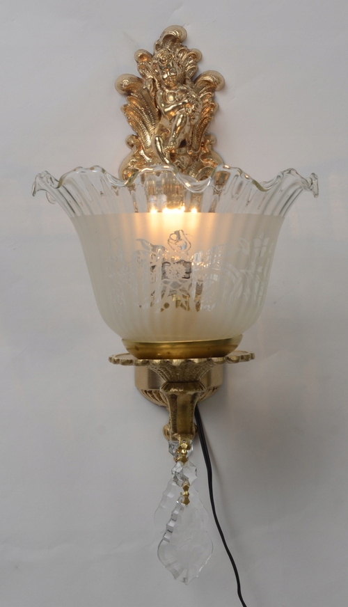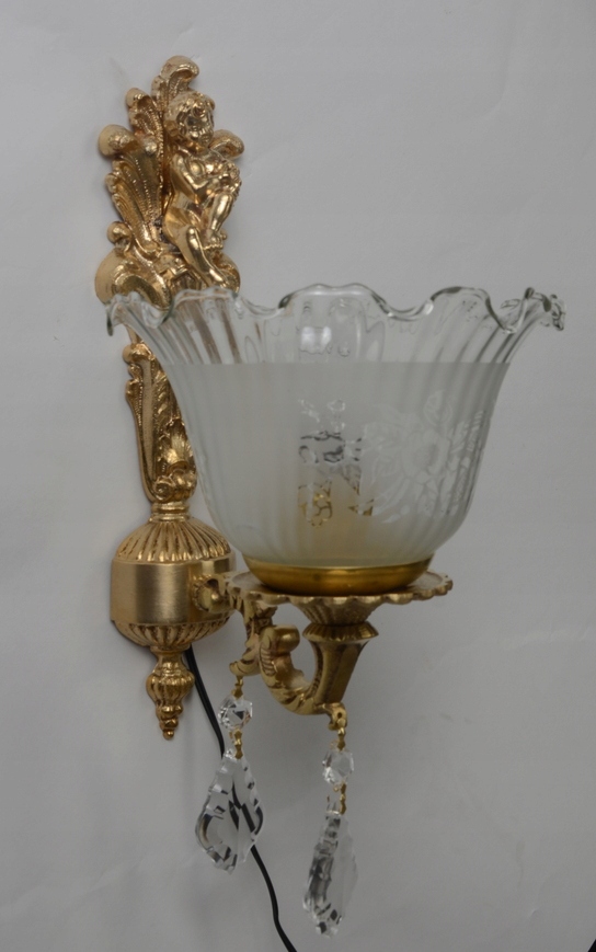 Тема аукціону - це оригінальні, чудово виготовлені настінні світильники з Іспанії з 1960 -х. Стінова лампа була виготовлена із золотої латуні. Запамування очей -це неймовірна точність виступу, дивовижно орнаментації. Настінна лампа дуже міцно зроблена. Увага привертає відтінок предмета, який виготовляється з молочного скла з офортними візерунками, додатковою прикрасою світильника є обробка у вигляді скляного прозорого фрілла. Актив набору - це дивовижно прикрашена настінна частина, а саме фігура ангела, розташованого безпосередньо над світильниками. Настінна лампа буде виглядати винятково в будь -якому інтер’єрі. Я напевно рекомендую !!!!