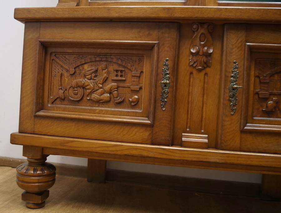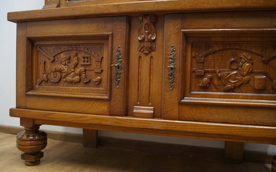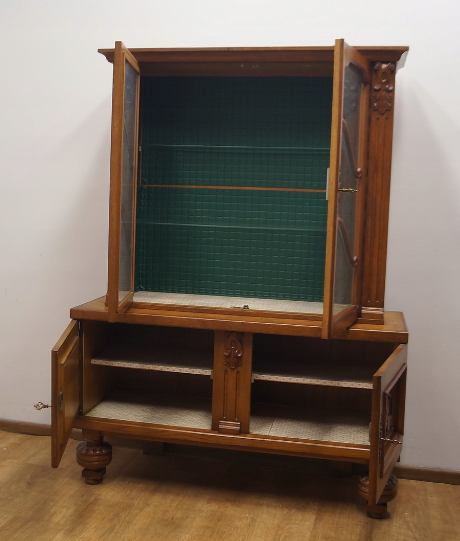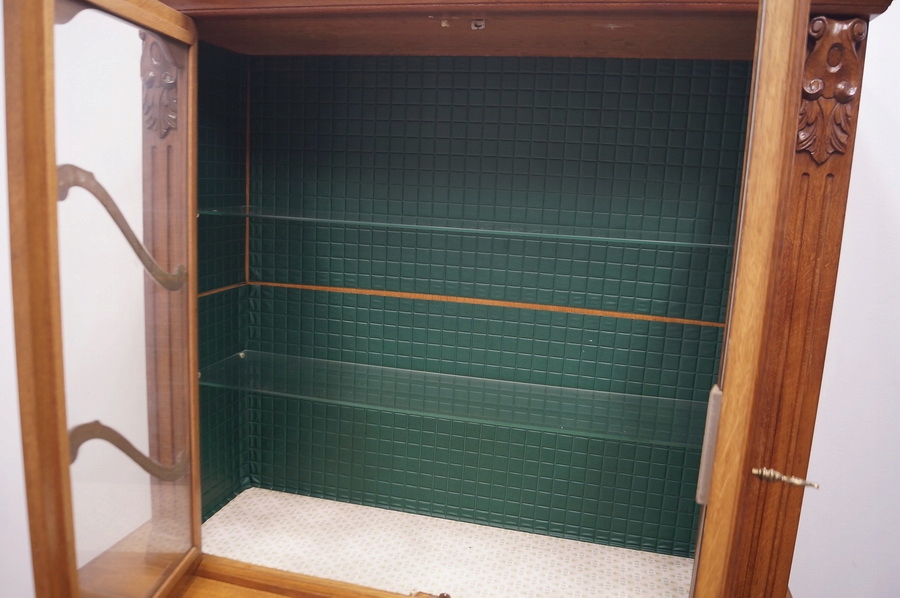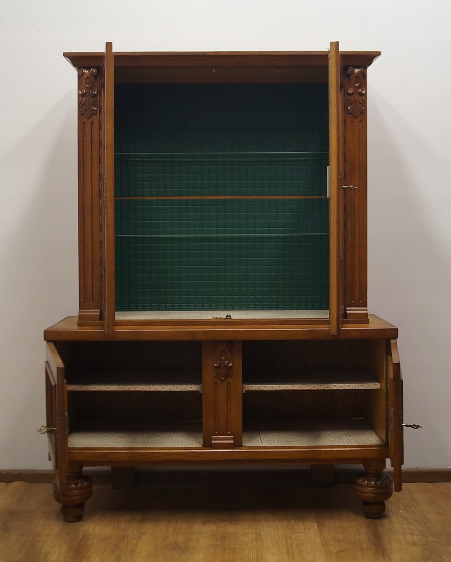 Вона має дві скляні дверцята вгорі та три гарно різьблені нижні дверцята. Вітрина прикрашена чудовою унікальною різьбою. Красиві різьблені елементи роблять цей предмет меблів унікальним та особливим.