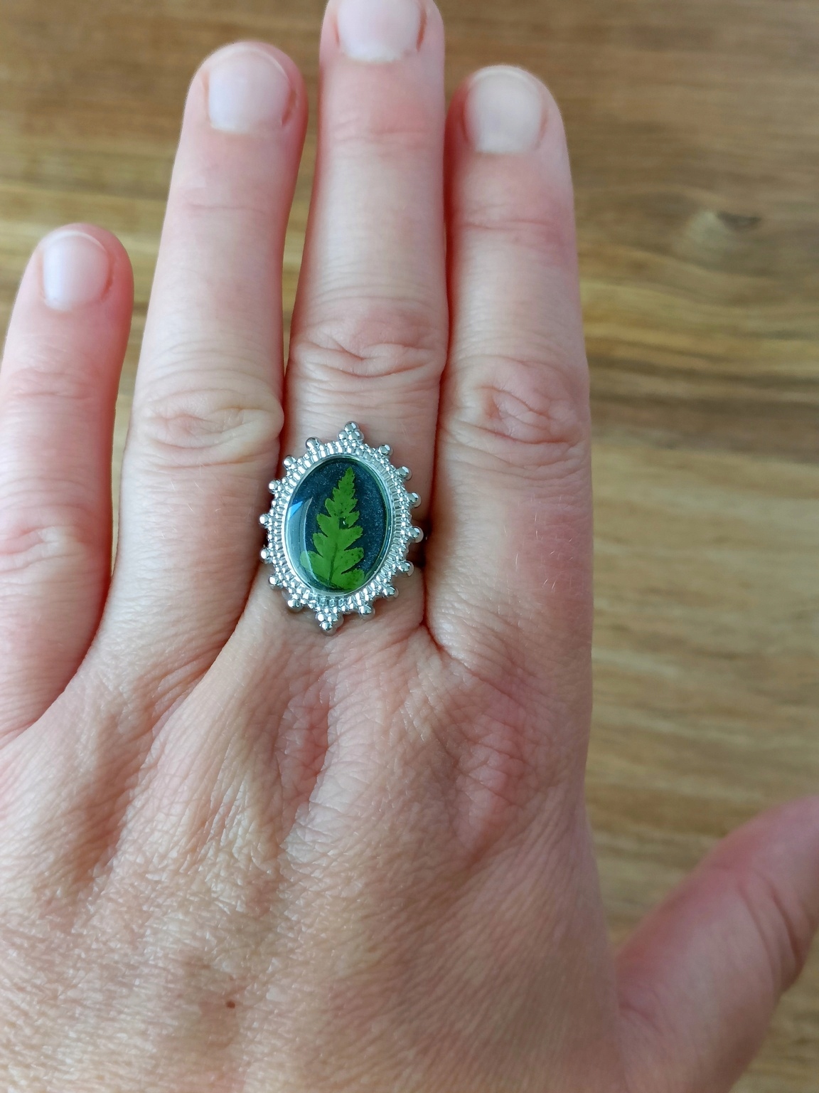 унікальна, магія смоляної магії. Натхненний природою, він містить увічнений, у високоякісній прозорі смоли, висушений папоротний лист. Рослини, розміщені на тлі чорної перлини. За запитом кольору фону можна використовувати будь -який. B> Розміри всього кільця зі сталевою рамою: 2,4 х 1,8 см. : Сталева благородна, якість -смола, справжні рослини.