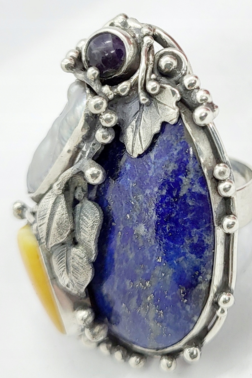 Кільце Lapis-Lalasie, Балтійська бурштина, Аметіст та прісноводна перлина.