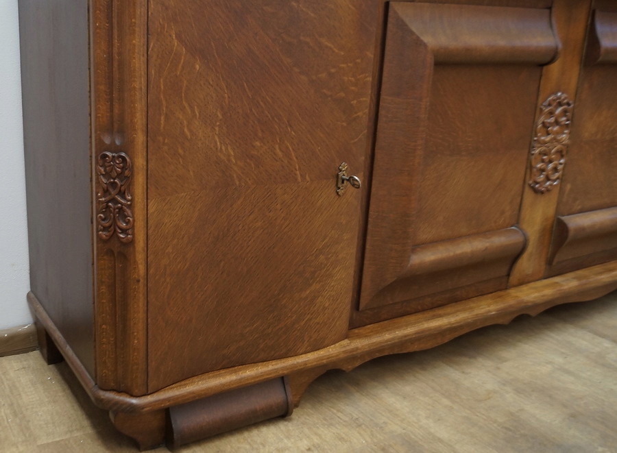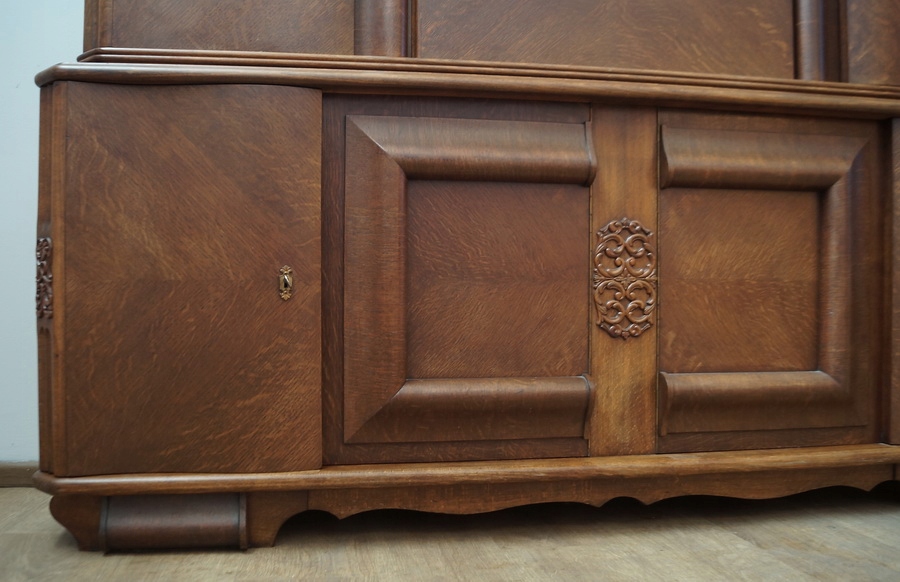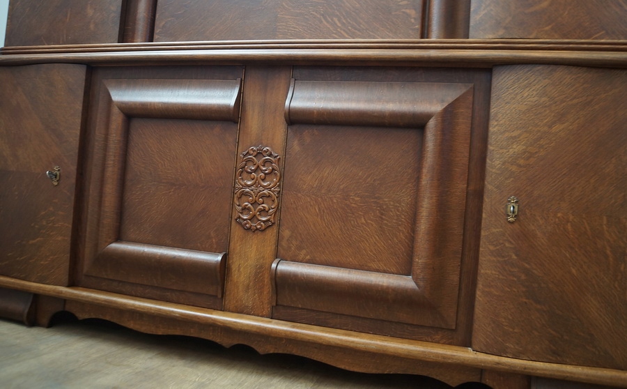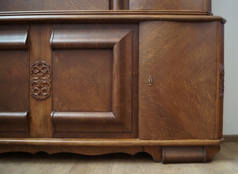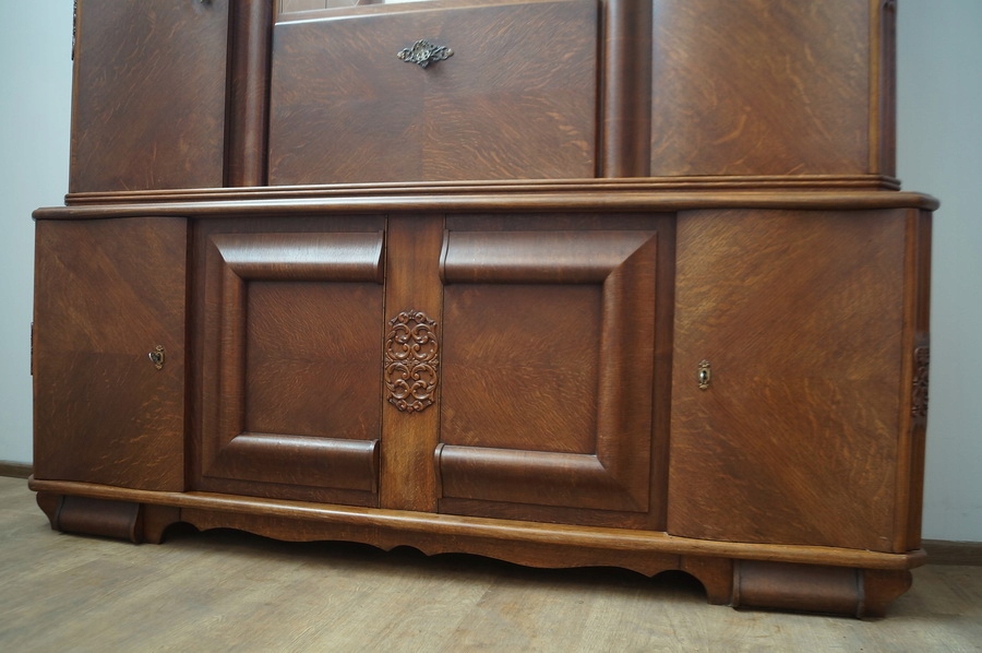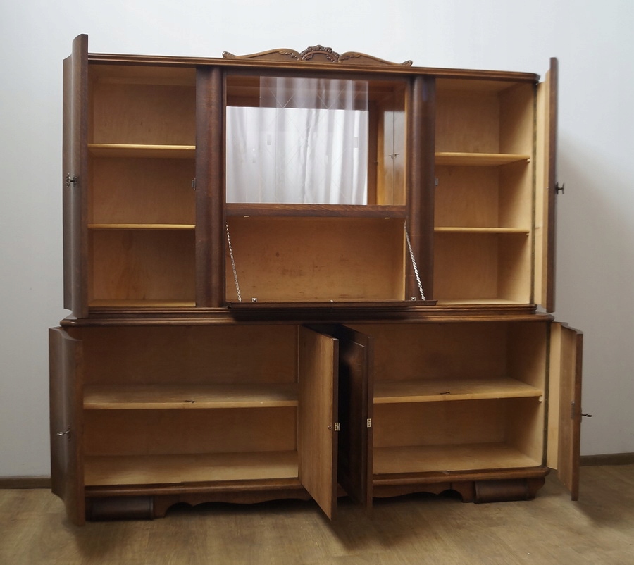 Тема продажу - це прекрасний сервант. Прекрасно вирізаний лук над дверима. Чотири нижні двері красиво оформлені, декоративні різьблення з боків. Красиві елементи роблять ці меблі унікальними та унікальними. Це дуже репрезентативний об’єкт, який, безумовно, прикрасить більше одного інтер'єру з його чарівністю. Світлові ознаки використання. Купівля