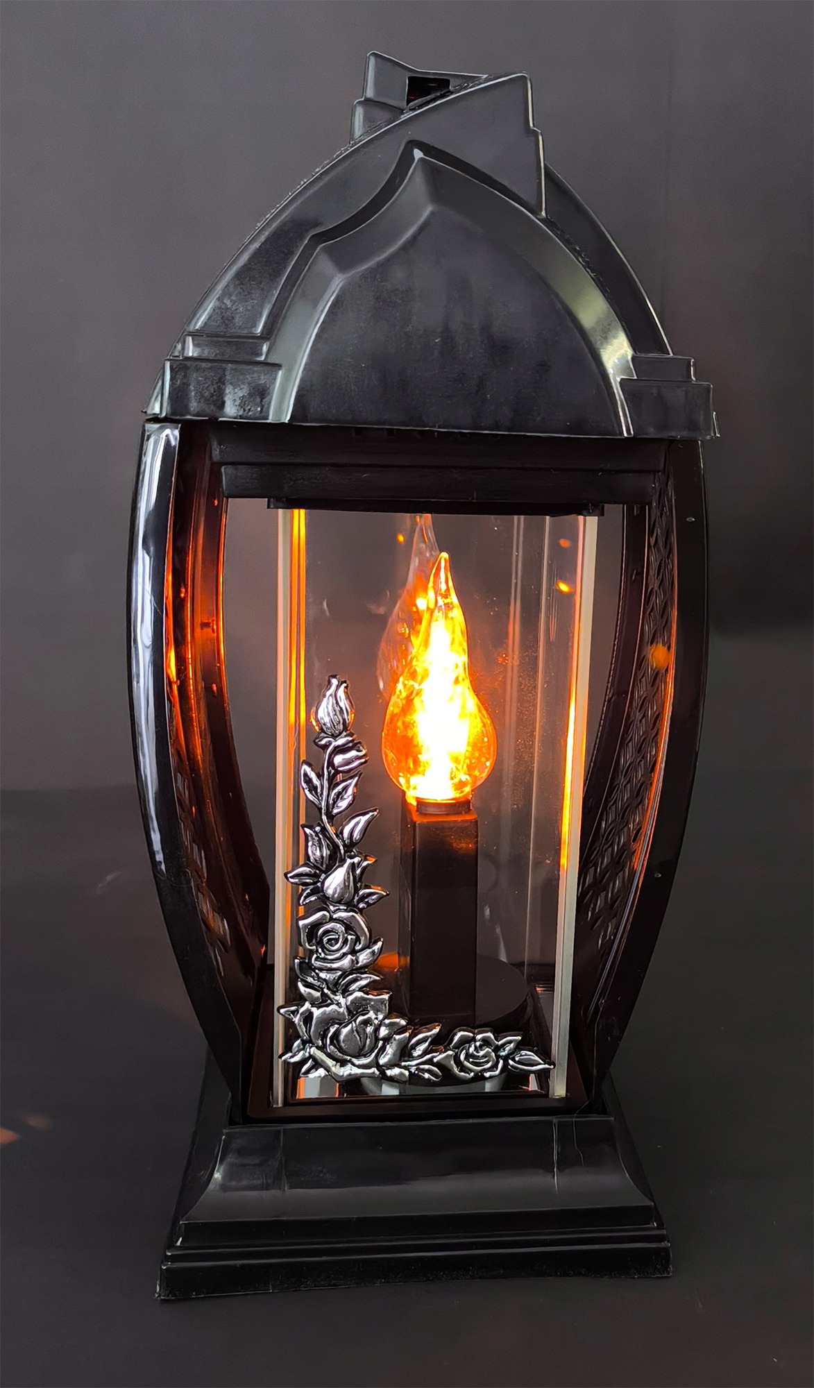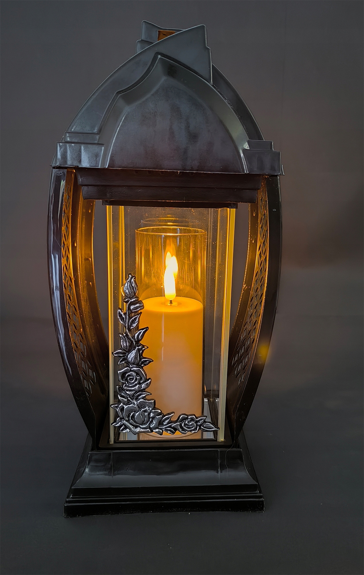 Каплиця для могили, виготовленої з густого і безбарвного скла. Корпус чорної свічки був виготовлений з пластику і закінчився в блиску. Свічка важка, міцна і добре зроблена.