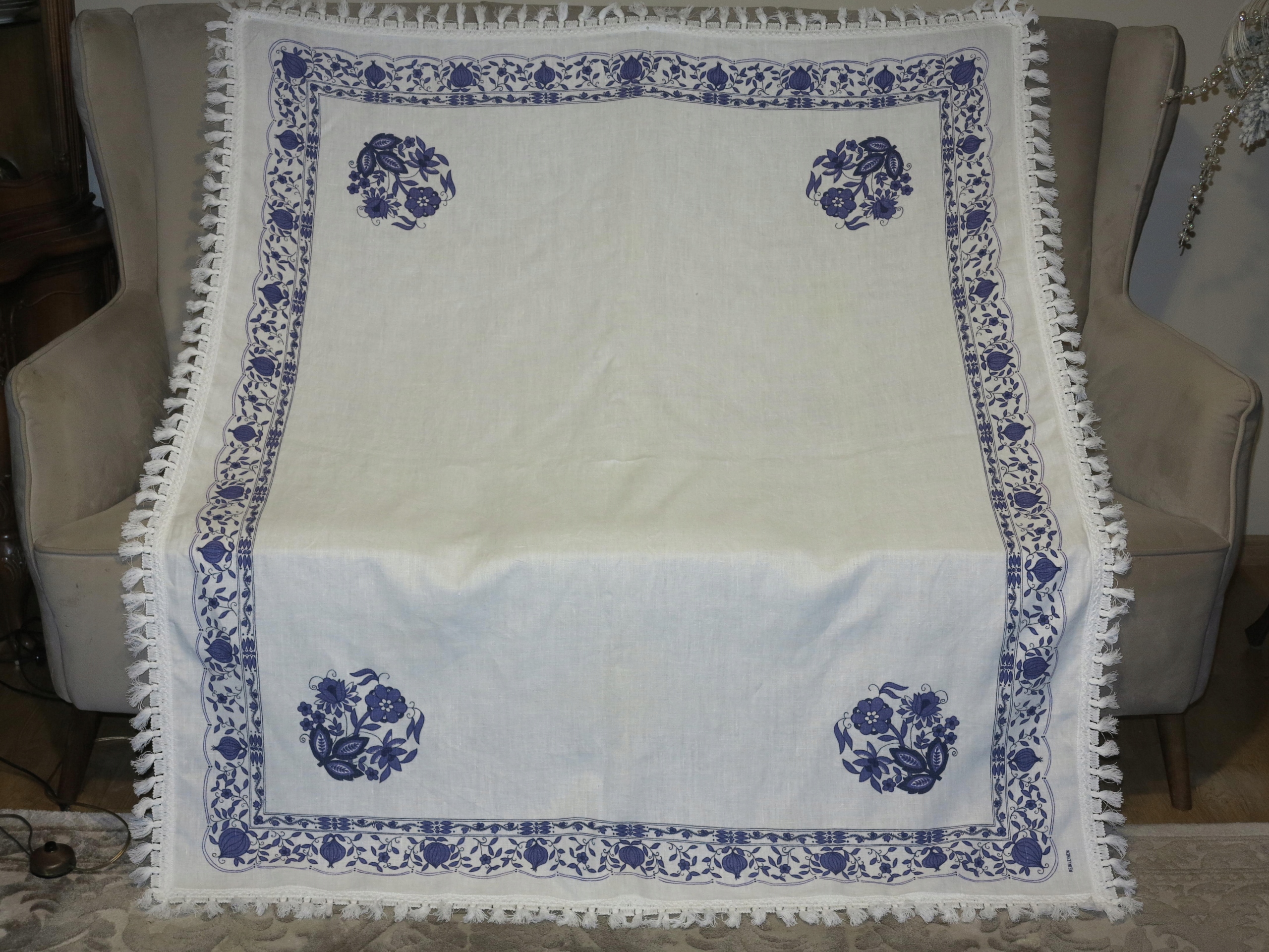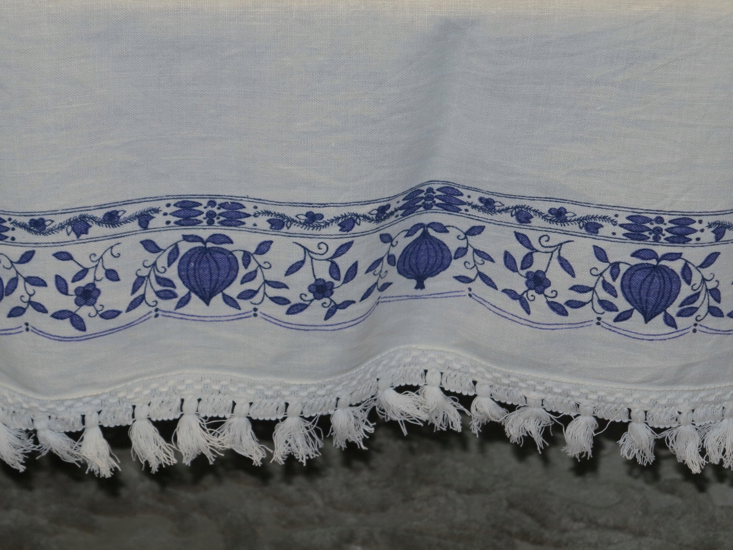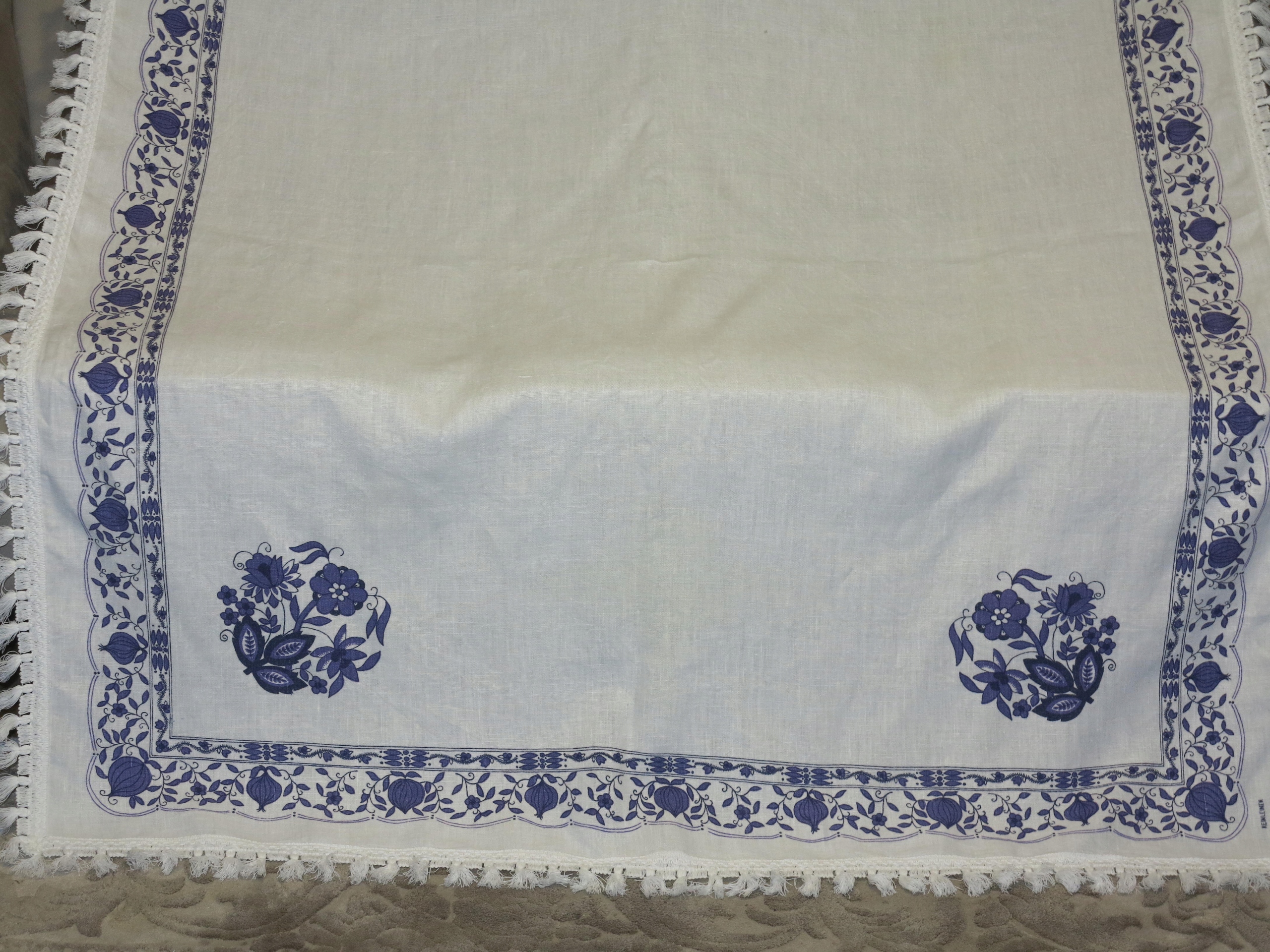 АНТИЧНУ - ГАРНУ, СТОЛІТНЮ ЛЬНЯНУ СКАТЕРТИНУ З УНІКАЛЬНИМ ЦИБУЛЬНИМ РИСУНКОМ. НАВКОЛ ОБРАБОТКИ З ПІКО
