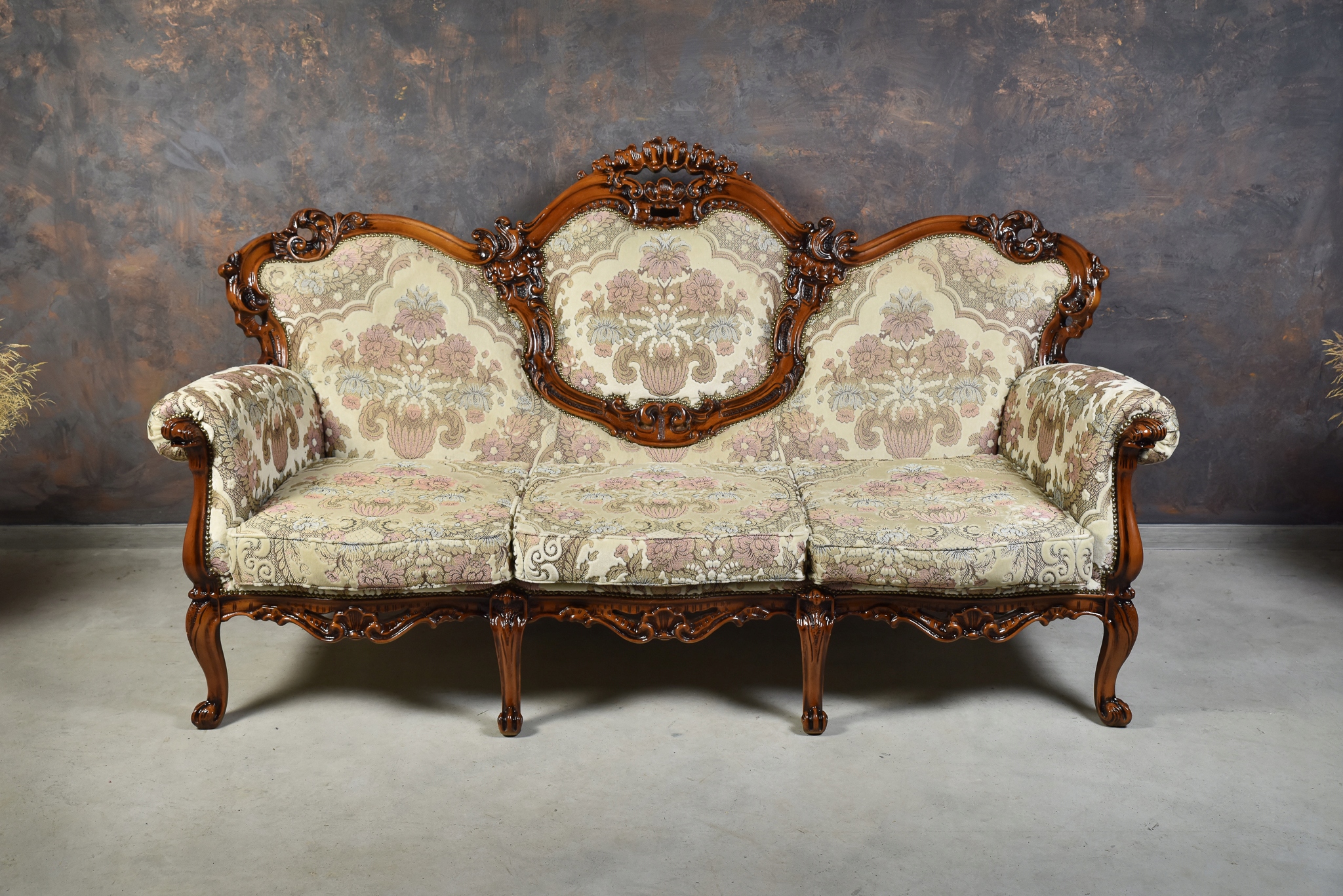 Виготовлений з масиву горіхового дерева, багато декорований. Оригінальна оббивка в дуже хорошому стані. Красиві прикраси ручної роботи надають йому унікального характеру.
